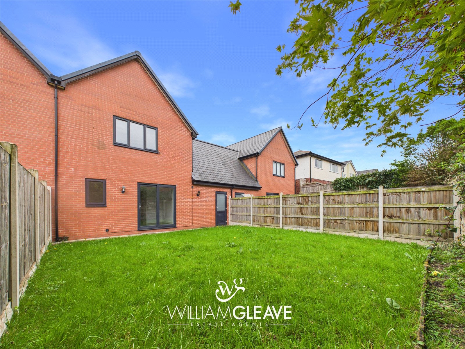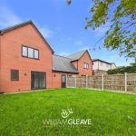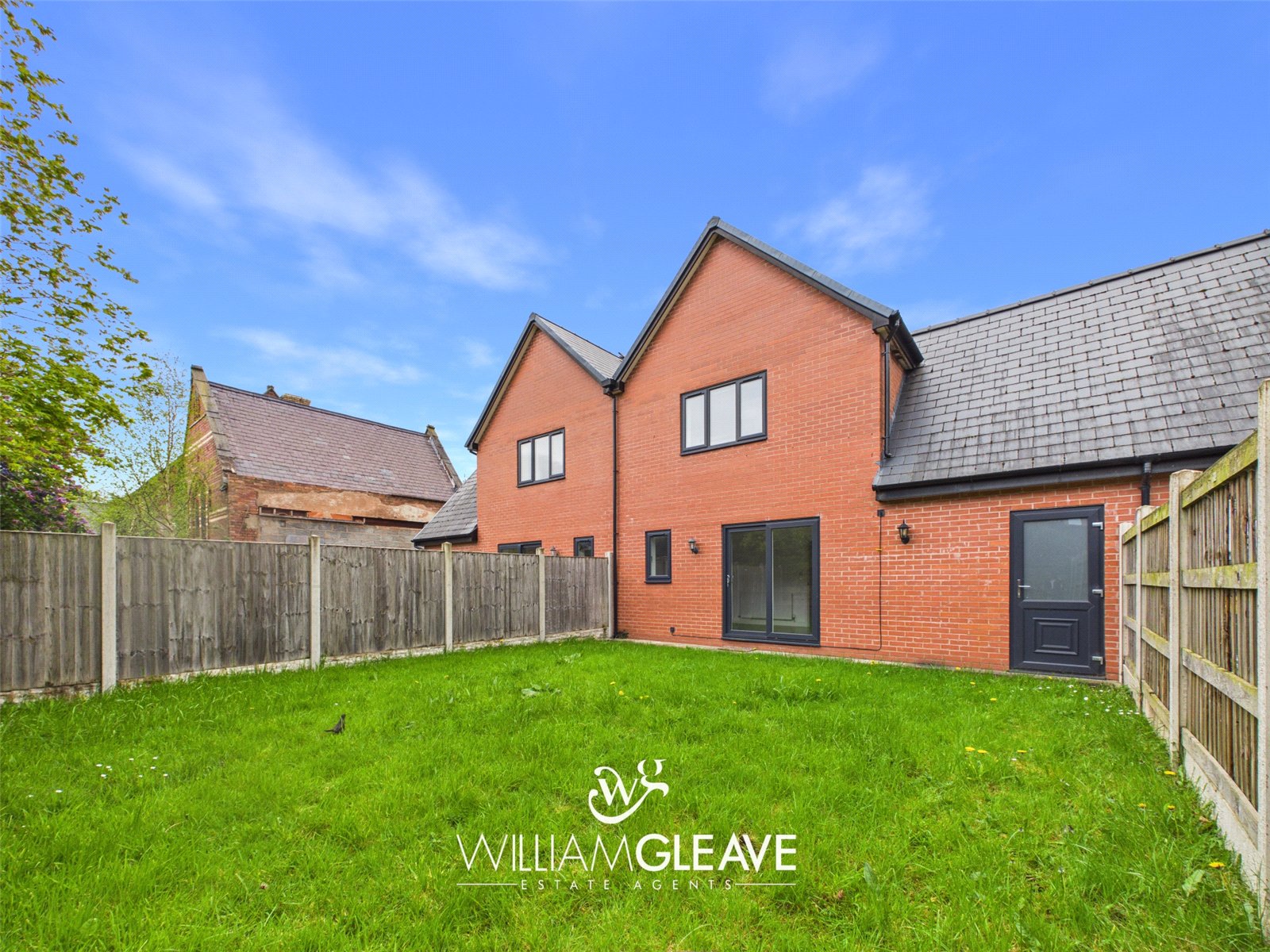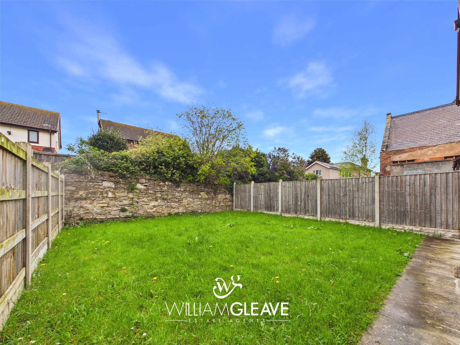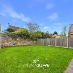 The rear garden is predominantly laid to lawn and enclosed by a combination of wood panel fencing, brick, and stone walling, offering a good degree of privacy.