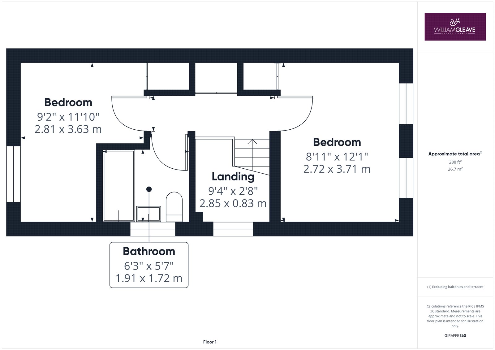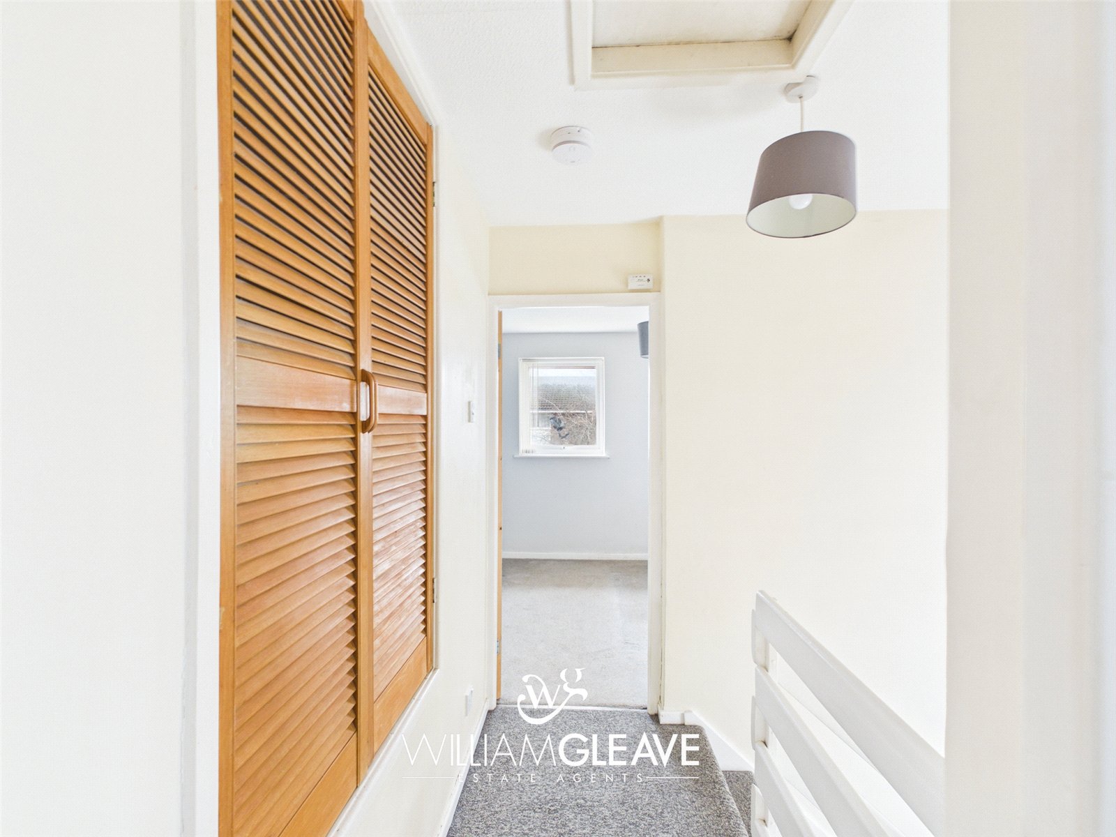 The landing continues with carpeted flooring from the stairs, creating a comfortable and cohesive feel. From here, there is access to both bedrooms and the bathroom, along with a useful storage cupboard for added practicality.