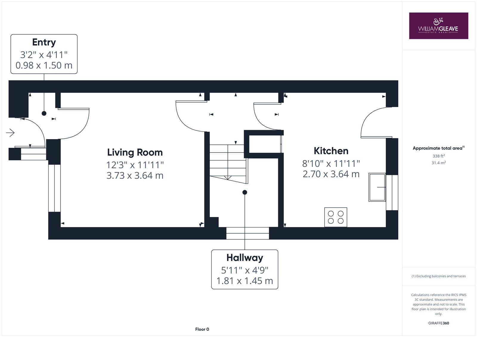 Following on from the living room, you enter the hallway, which is finished with white painted walls and fitted carpet. The space benefits from heating and provides access to the staircase leading to the first floor and all further rooms within the property.