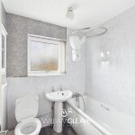 A frosted double-glazed window to the rear elevation allows natural light to brighten the room while maintaining privacy. The space also benefits from heating, towel rails, and a storage cabinet, adding both comfort and practicality to this well-presented bathroom.