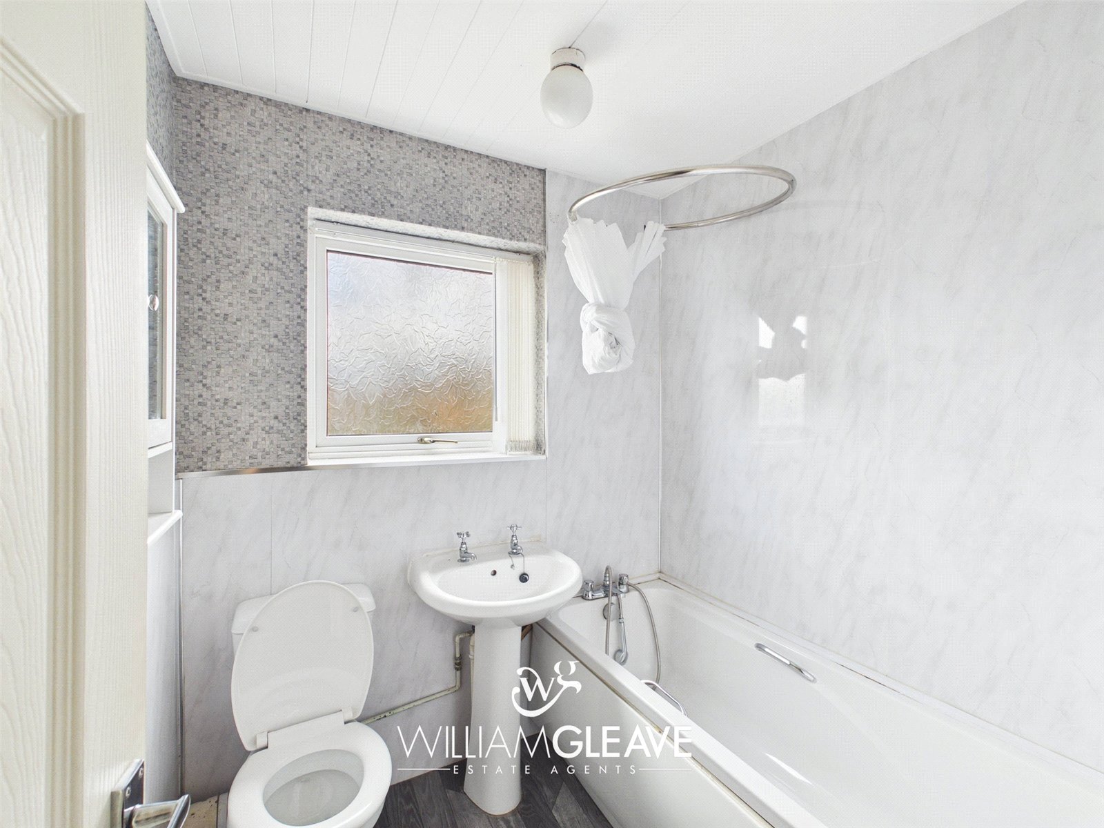 The bathroom is stylish and well equipped, finished with white and grey marble-effect wall tiling that creates a modern and elegant feel. It comprises a three-piece suite including a white panelled bath, wash hand basin, and low-level WC, all complemented by sleek stainless-steel fittings.