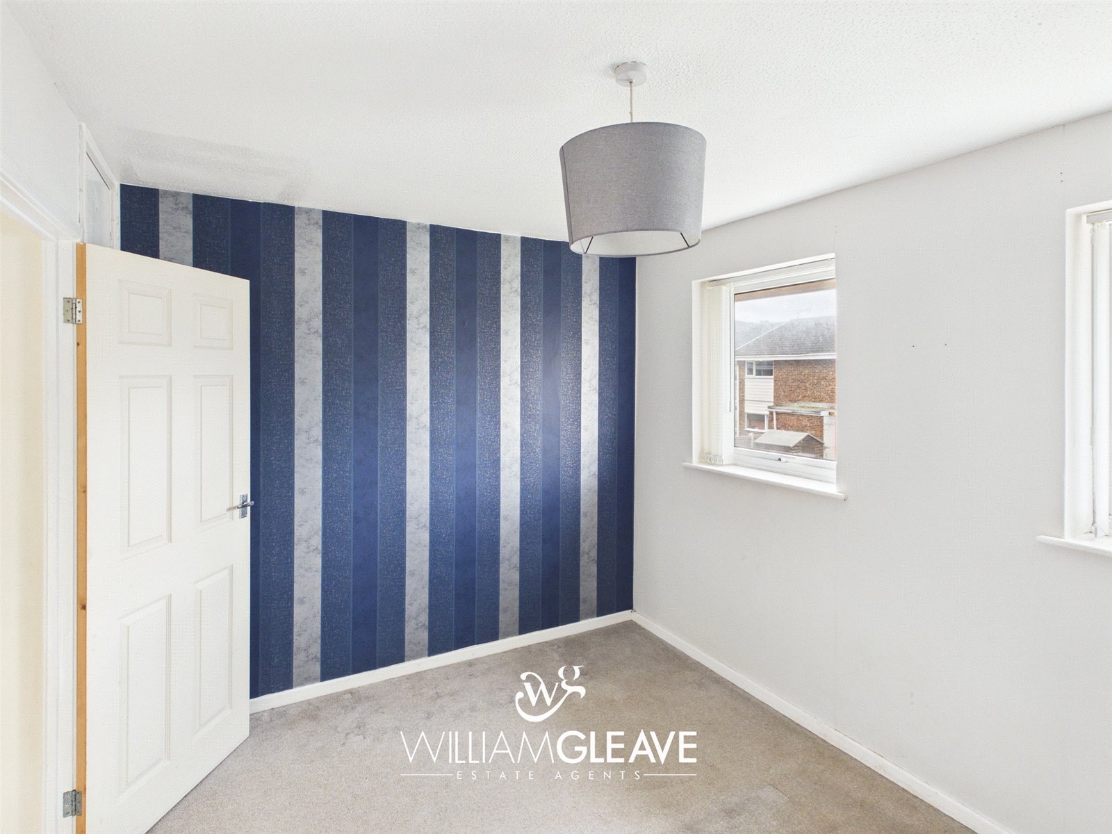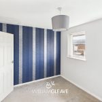The first bedroom is a spacious double bedroom featuring two double-glazed windows to the side elevation, allowing for plenty of natural light and pleasant side views. The two side walls are painted white, while the front and rear walls are finished with blue wallpaper in a similar style to the décor in the lounge, creating a cohesive feel throughout the home.