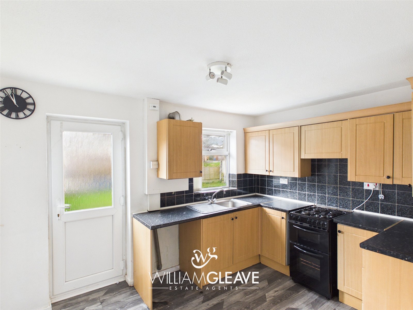 The kitchen is located to the rear of the property and features a range of wooden wall and base units, complemented by sleek black granite worktops. Matching black granite tiles run halfway up the walls, with the remaining walls finished in white paint, creating a modern and stylish contrast. A stainless-steel sink with mixer tap is inset within the worktop, and there is dedicated space for appliances.
