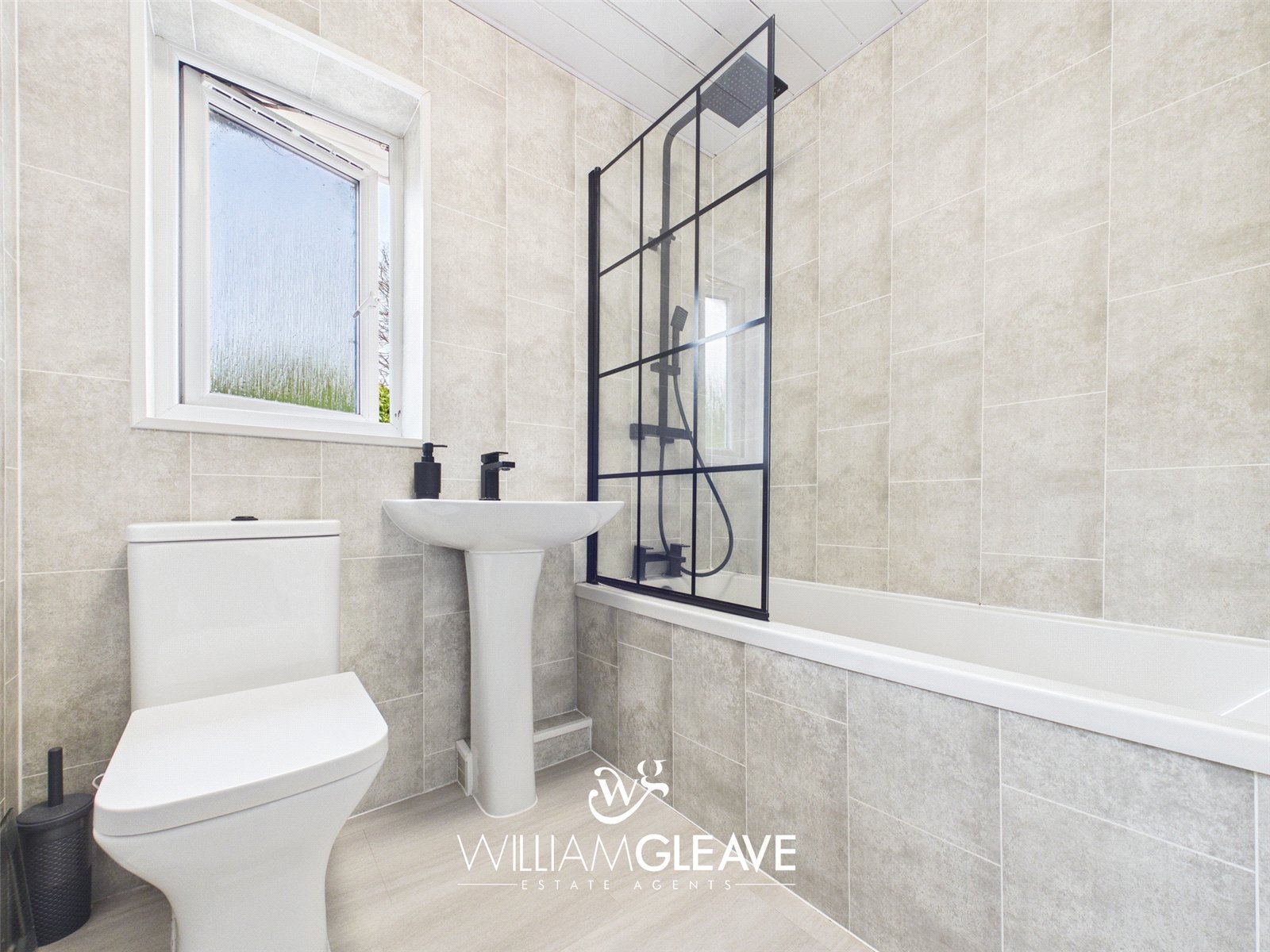 The family bathroom is fitted with a modern three-piece suite, comprising a bath with overhead shower, pedestal wash hand basin and low-level toilet. There is a frosted window to the rear elevation. Finished with stylish black fittings and a heated towel radiator, this is a contemporary and well-presented space.