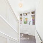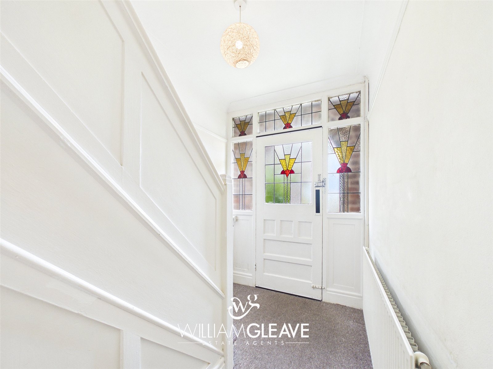 The entrance hall is accessed via a beautiful stained glass wooden door. This welcoming space features stairs rising to the first floor landing, with doors leading off to the living room, dining room, and kitchen. A radiator provides warmth, and there are conveniently placed power points.