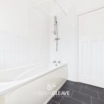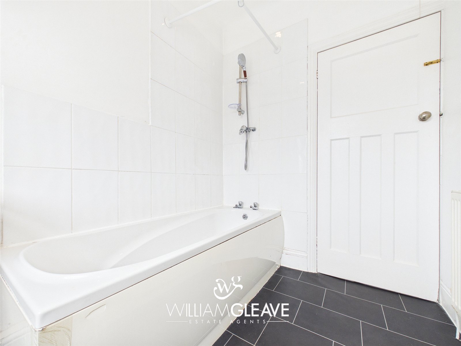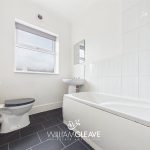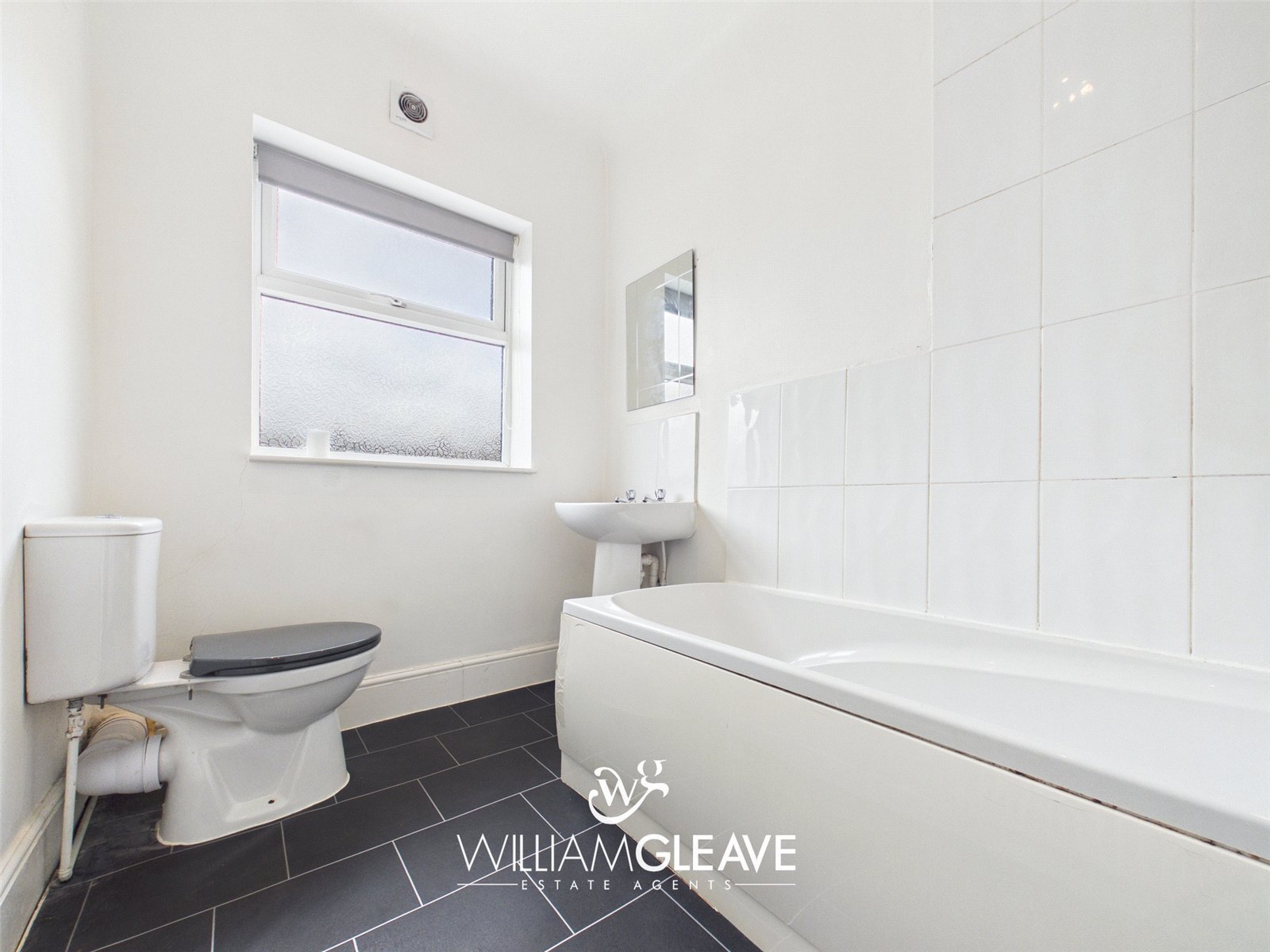 The bathroom is fitted with a frosted window to the rear elevation. It comprises a three-piece suite including a bath with overhead shower, pedestal wash basin, and a low-level WC. A radiator provides warmth, completing this functional family bathroom.