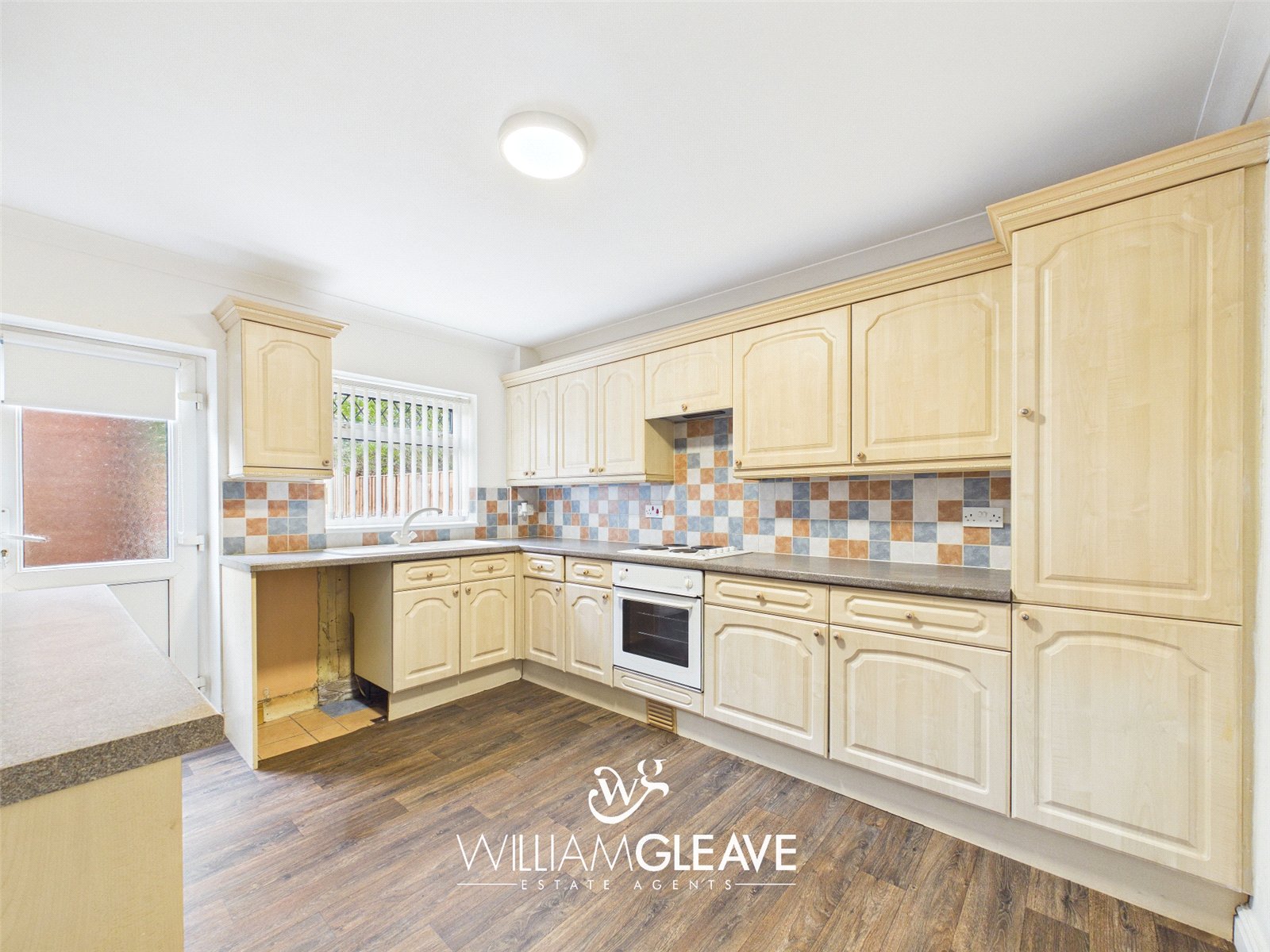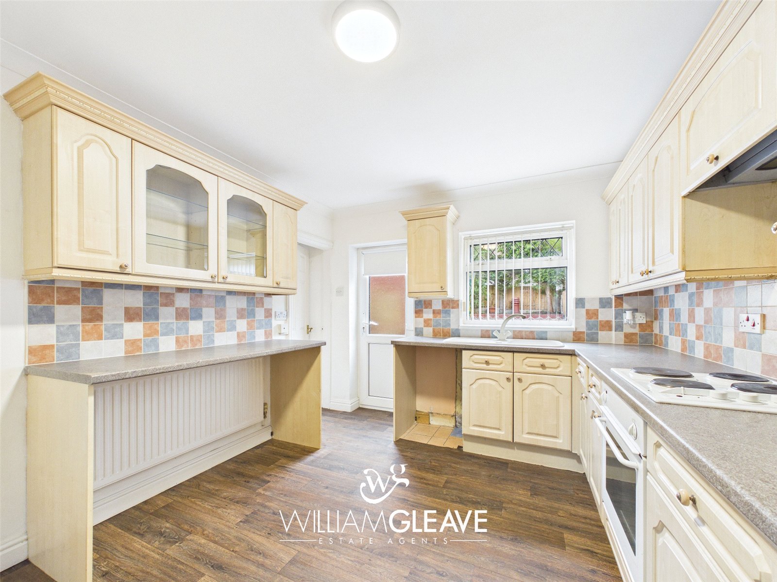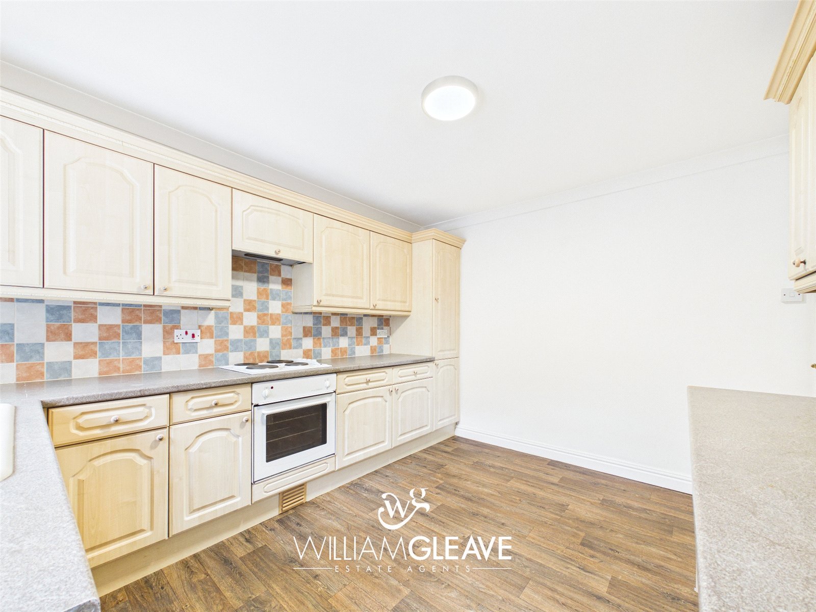 The kitchen is well equipped and thoughtfully laid out, featuring a range of integrated appliances and ample workspace. A double glazed window to the rear elevation brings in plenty of natural light, while a upvc door provides direct access to the rear garden. There’s also a breakfast bar for casual dining, along with a radiator and conveniently placed power points throughout.
