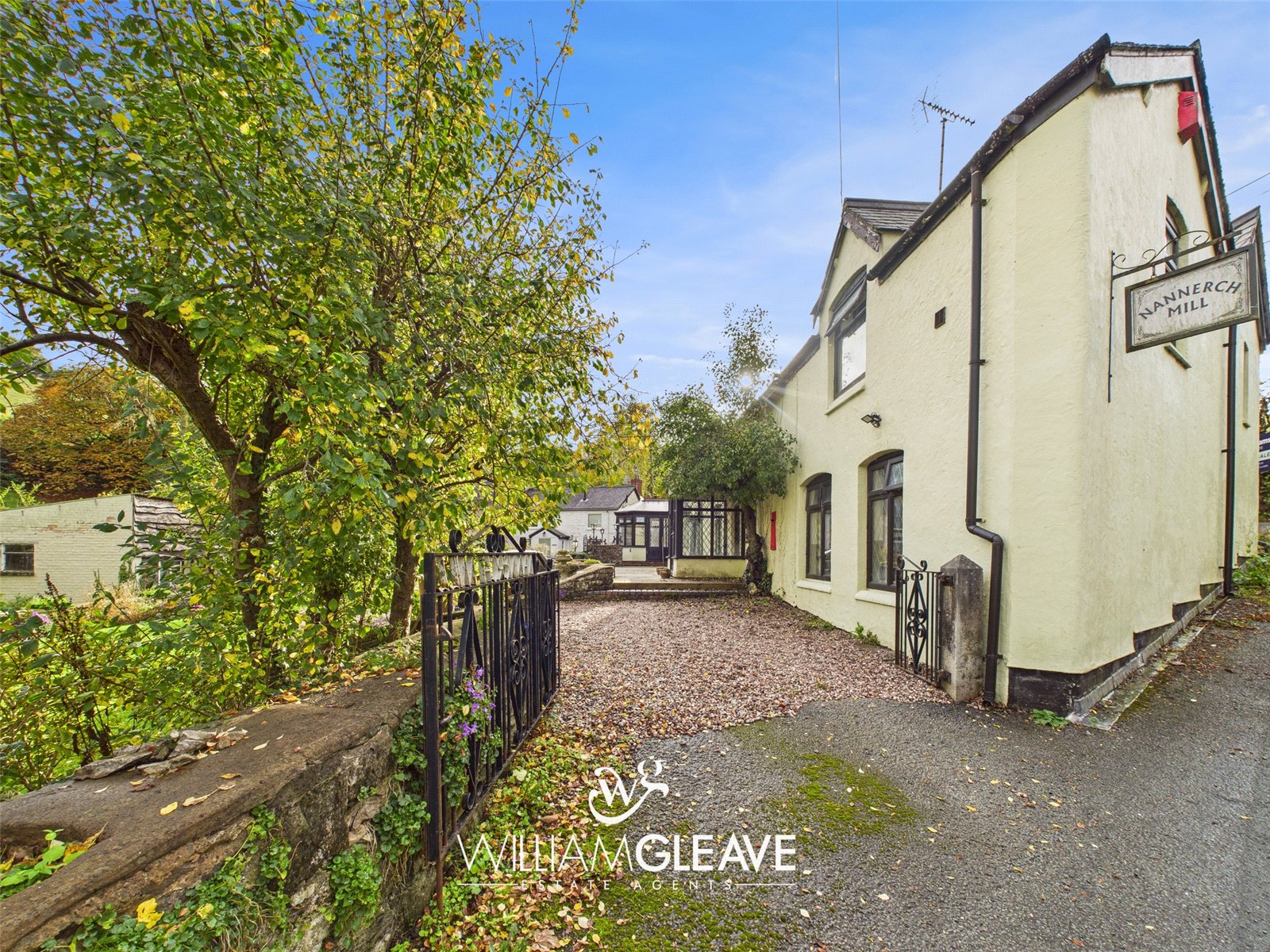 The property is approached via wrought iron gates leading to a generous stoned driveway that provides ample off-road parking. A low step up gives access to a large decking area, with steps descending into a spacious front lawned garden. The garden is attractively bordered by mature plants, hedging, and trees, including an apple tree along with pear, raspberry, and redcurrant varieties. Traditional stone walls enclose the space, adding character. A small wrought iron gate opens to a long shared driveway, where the double garage with car port are located. To the side elevation, there is a patio area and an additional outbuilding. From the garden, you can enjoy the peaceful sound of a nearby stream, creating a relaxing outdoor setting.