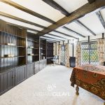 Accessed from the kitchen via a traditional wooden door and a low step down, this generously sized and versatile room could serve as a dining room, additional reception room, or a downstairs bedroom. The room is carpeted throughout and features traditional wall panelling, multiple double power sockets, and two wall-mounted double-panel radiators. Built-in storage cupboards, shelving, and a fitted desk provide practical workspace and storage solutions. Multiple double-glazed windows to the front elevation allow plenty of natural light, complemented by two wall light fittings and exposed beamed ceilings. A door provides access to a convenient downstairs WC.
