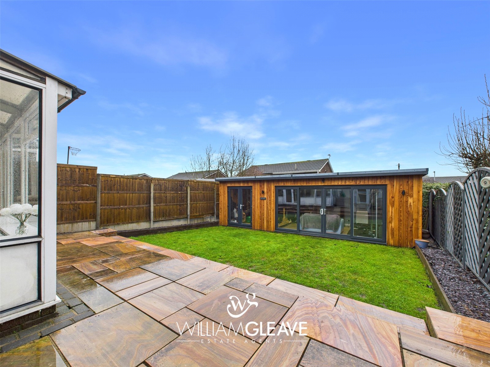 To the rear, the garden includes an Indian stone patio, ideal for outdoor furniture and entertaining. The remainder of the garden is laid to lawn and complemented by areas of decorative purple slate. It is enclosed by wood-panel fencing and provides direct access to the garden room.