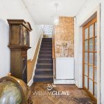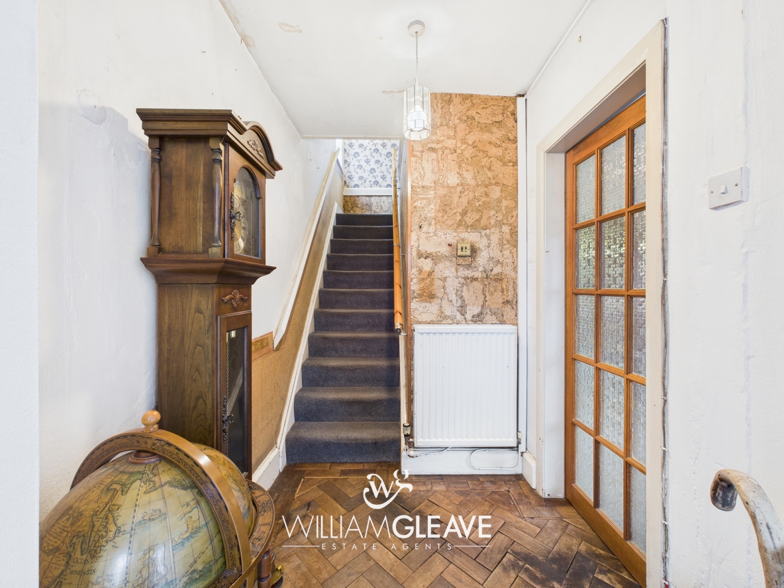 The welcoming hallway benefits from an open porch that enhances the sense of space and light. A solid wooden entrance door and windows with secondary glazing, allowing plenty of natural light to flow through. The flooring combines tiled and original wooden parquet, adding warmth and character. Stairs lead to the first floor, with a doorway providing access to the living room.