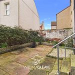 The rear garden is low-maintenance, featuring a patio area with shrubs to the back. Concrete steps lead up into the kitchen, and a shed is also provided for additional storage.