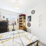 A well-proportioned double bedroom featuring soft carpeted flooring, neutral décor, central ceiling light, and multiple power sockets. A UPVC double-glazed window to the rear elevation enjoys views over the garden, complemented by a wall-mounted radiator beneath.