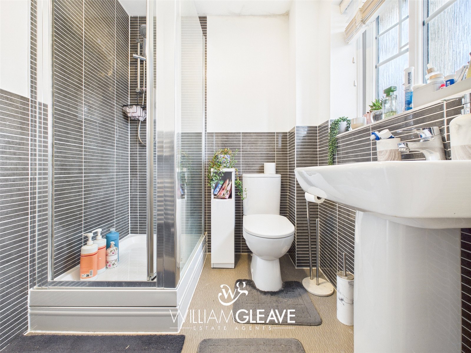 A modern en-suite comprising a low-flush WC, wash basin with mixer tap, and a corner shower unit with glazed screen and door. The room benefits from half-height tiled walls with a neutrally painted upper section, creating a bright and contemporary finish. There is a UPVC frosted double-glazed window to the front elevation, central ceiling light, extractor fan, and a wall-mounted heated towel rail.