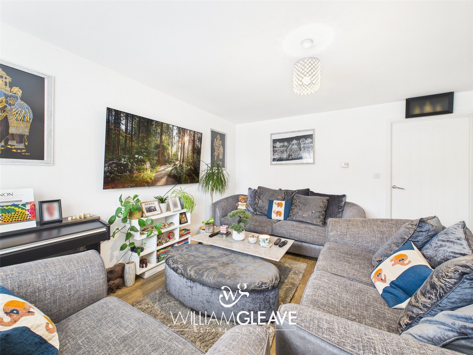 A spacious yet cosy living room, tastefully decorated in neutral tones to create a bright and airy atmosphere. A UPVC double-glazed window to the front elevation allows plenty of natural light, complemented by a wall-mounted radiator beneath. The room benefits from multiple power points, a central ceiling light, and an elegant wood-effect vinyl flooring. A wall-mounted thermostat provides temperature control. A door leads into a small foyer area, offering access to the downstairs WC, a storage cupboard, and the kitchen/diner.