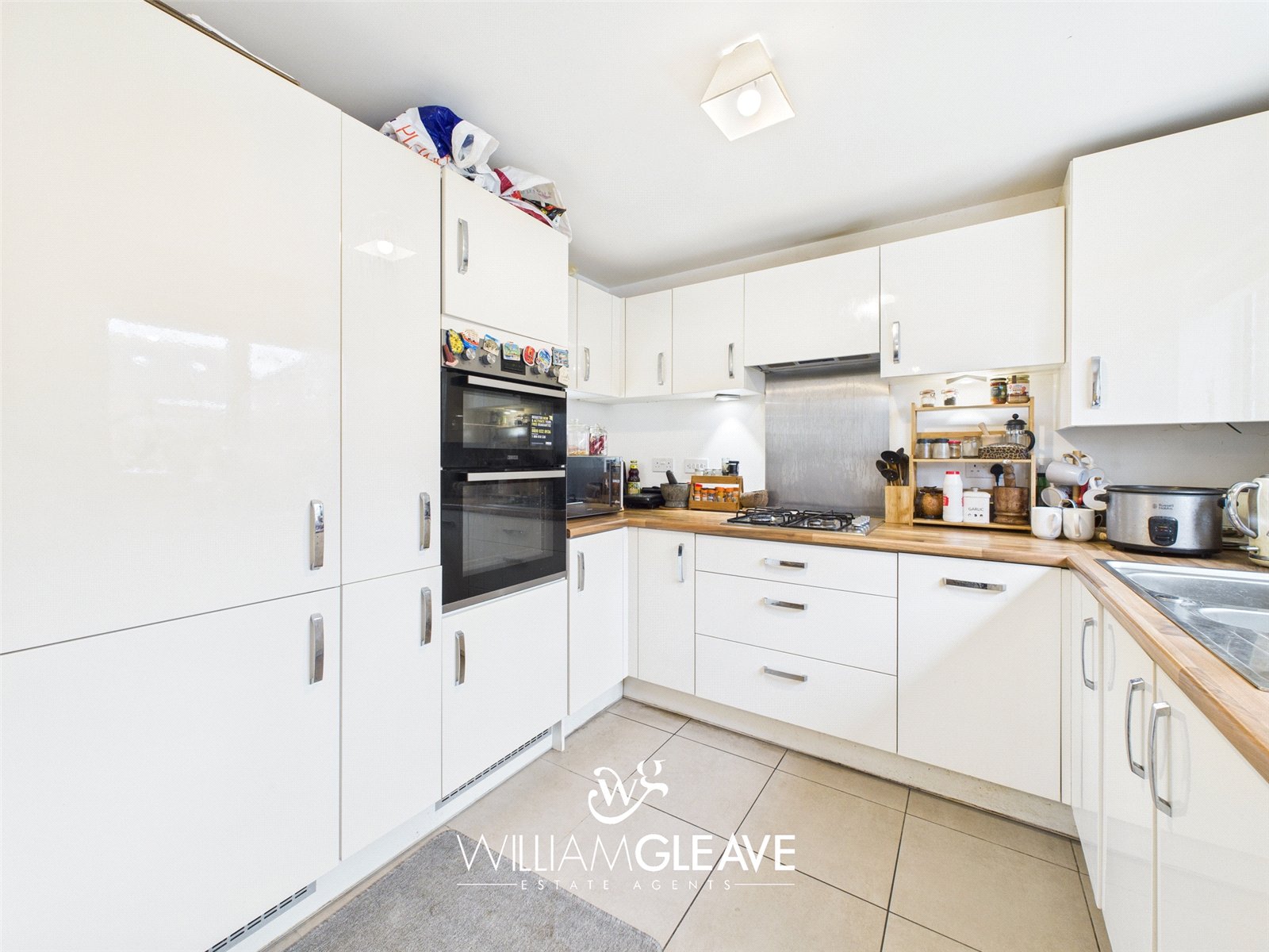 The modern kitchen is fully fitted with a range of wall and base units topped with wood-effect laminate worktops and enhanced by under-cupboard lighting. Integrated Zanussi double electric oven and grill, fitted gas hob with stainless steel splashback and overhead extractor, and an integrated fridge/freezer provide both style and functionality. A stainless steel 1.5 sink and drainer with mixer tap sits beneath a UPVC double-glazed window overlooking the garden. The mains gas Logic boiler is neatly housed within a cupboard, and there are ample power sockets conveniently positioned throughout.