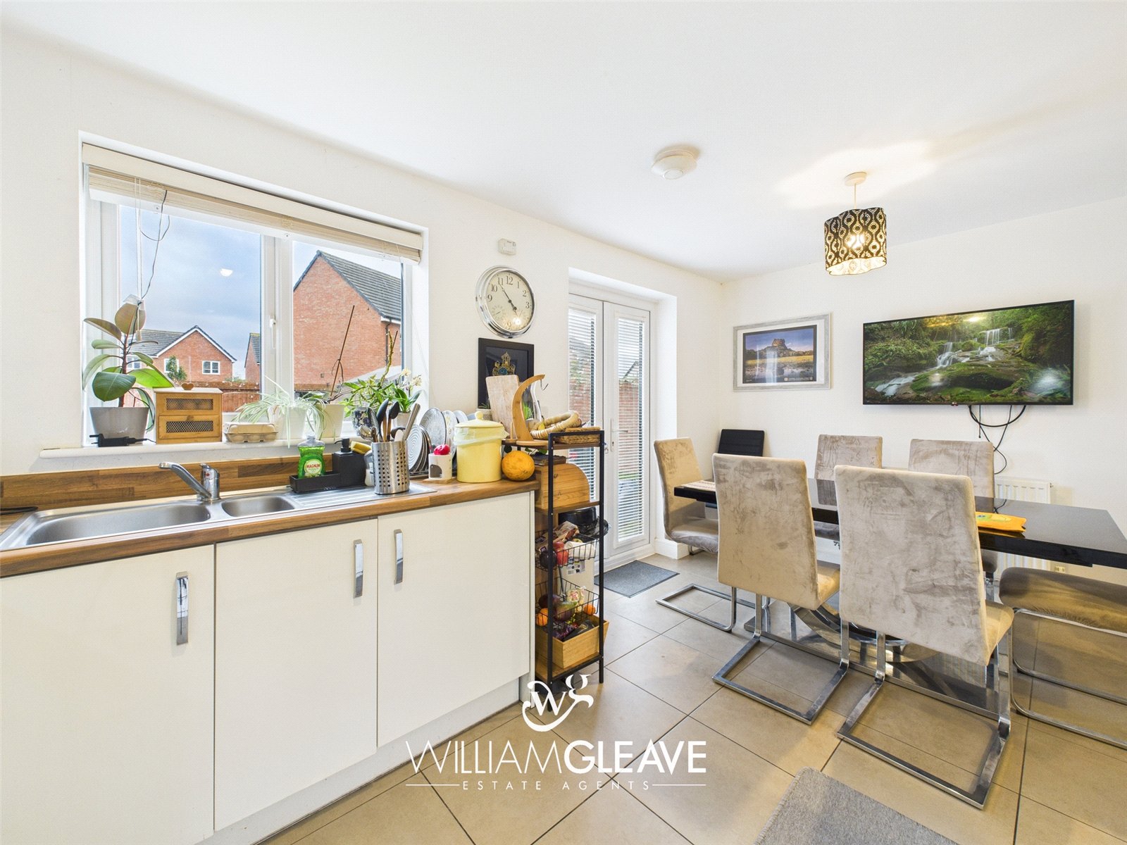 Step into a bright and spacious kitchen/diner, the true heart of the home. The room features three ceiling light fittings, a wall-mounted radiator, neutral décor, and elegant tiled flooring throughout. There is ample space for a full dining set, and UPVC double-glazed French doors flood the area with natural light while opening directly onto the rear garden, making the space ideal for entertaining and family living.