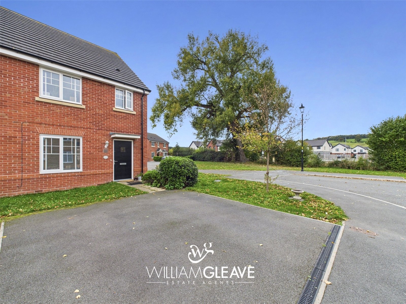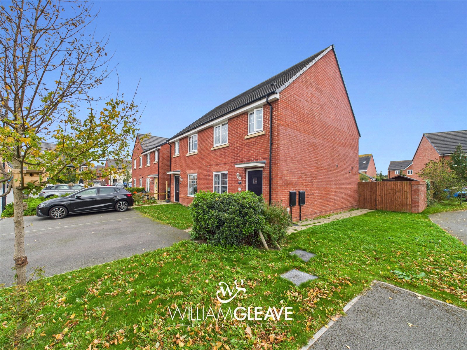 To the front of the property is a private driveway bordered by a small front lawn, with a further lawned area extending down the side of the home. The driveway comfortably provides off-road parking for two vehicles. A paved path leads to the front door and continues around the side, giving access via a wooden gate to the rear garden.