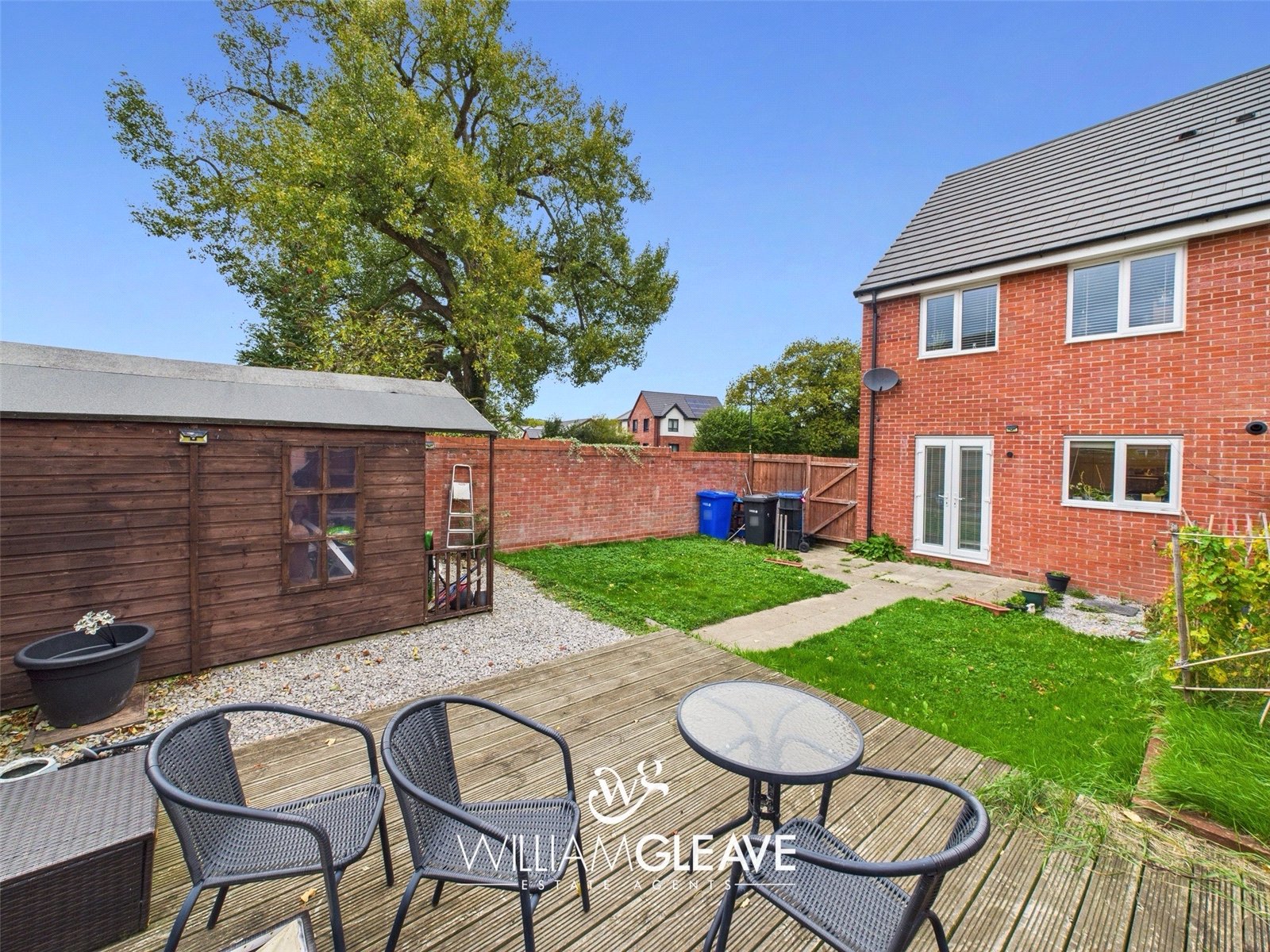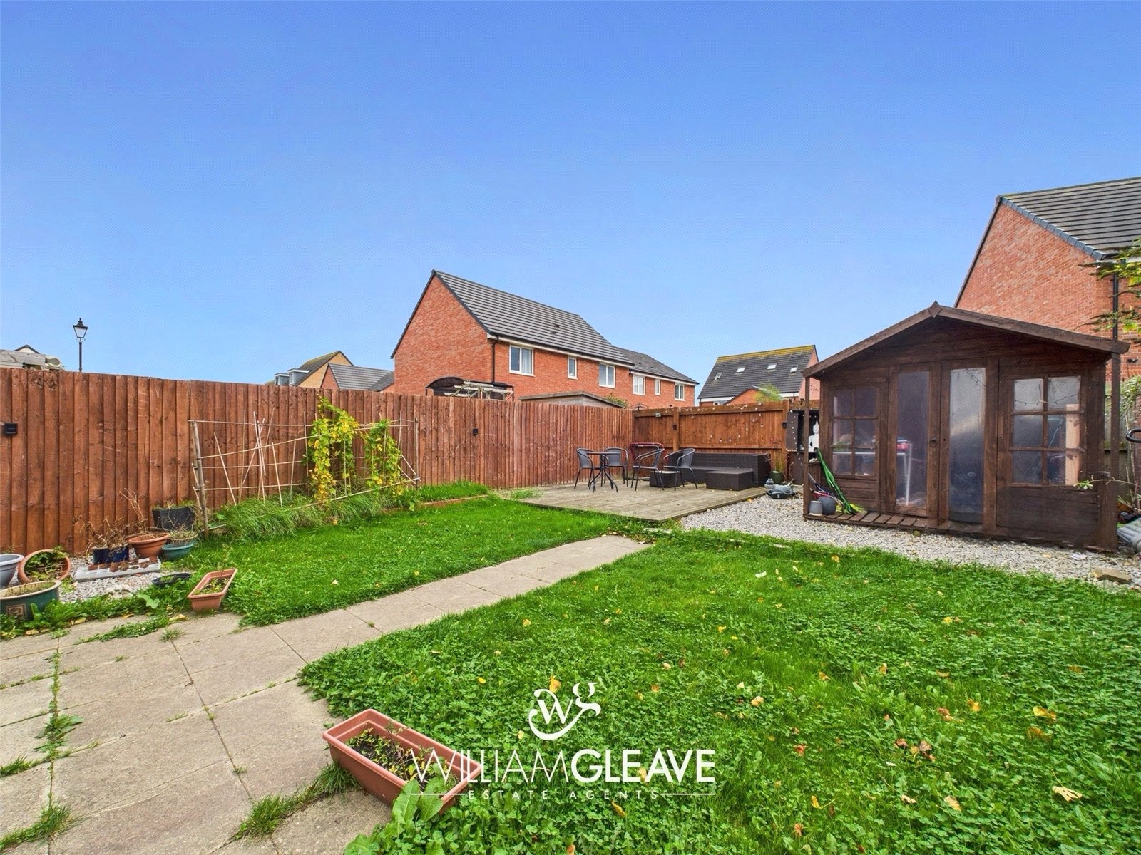 The south-facing rear garden is fully enclosed for privacy and security, bordered by a mix of high wooden fencing and brick walling. The garden features a patio area, stoned sections, and a paved path leading to a decked seating area, the perfect spot for relaxing or entertaining. Either side of the path is a manageable lawn, and there is an additional stoned area where the current owners have positioned a garden shed.