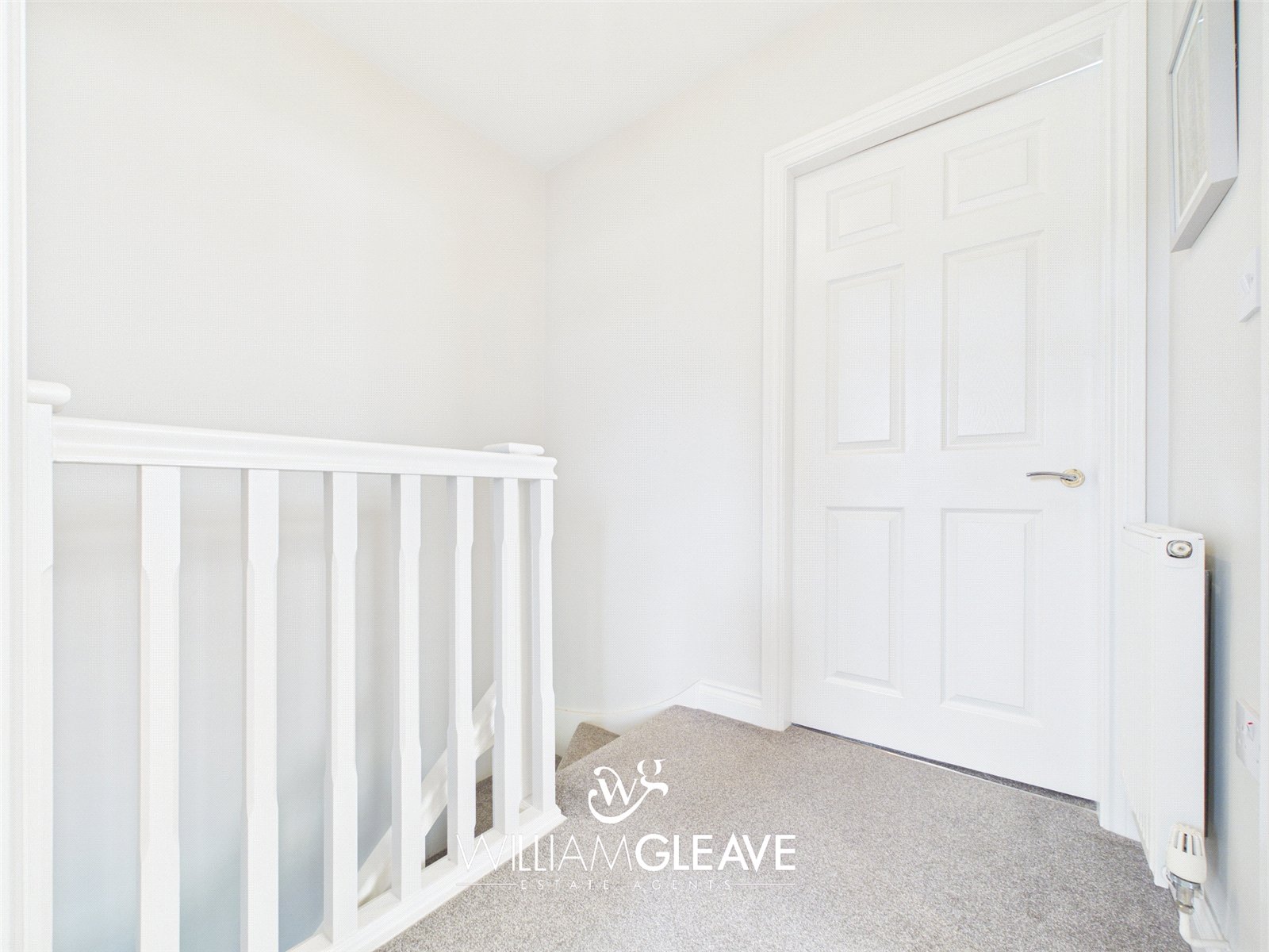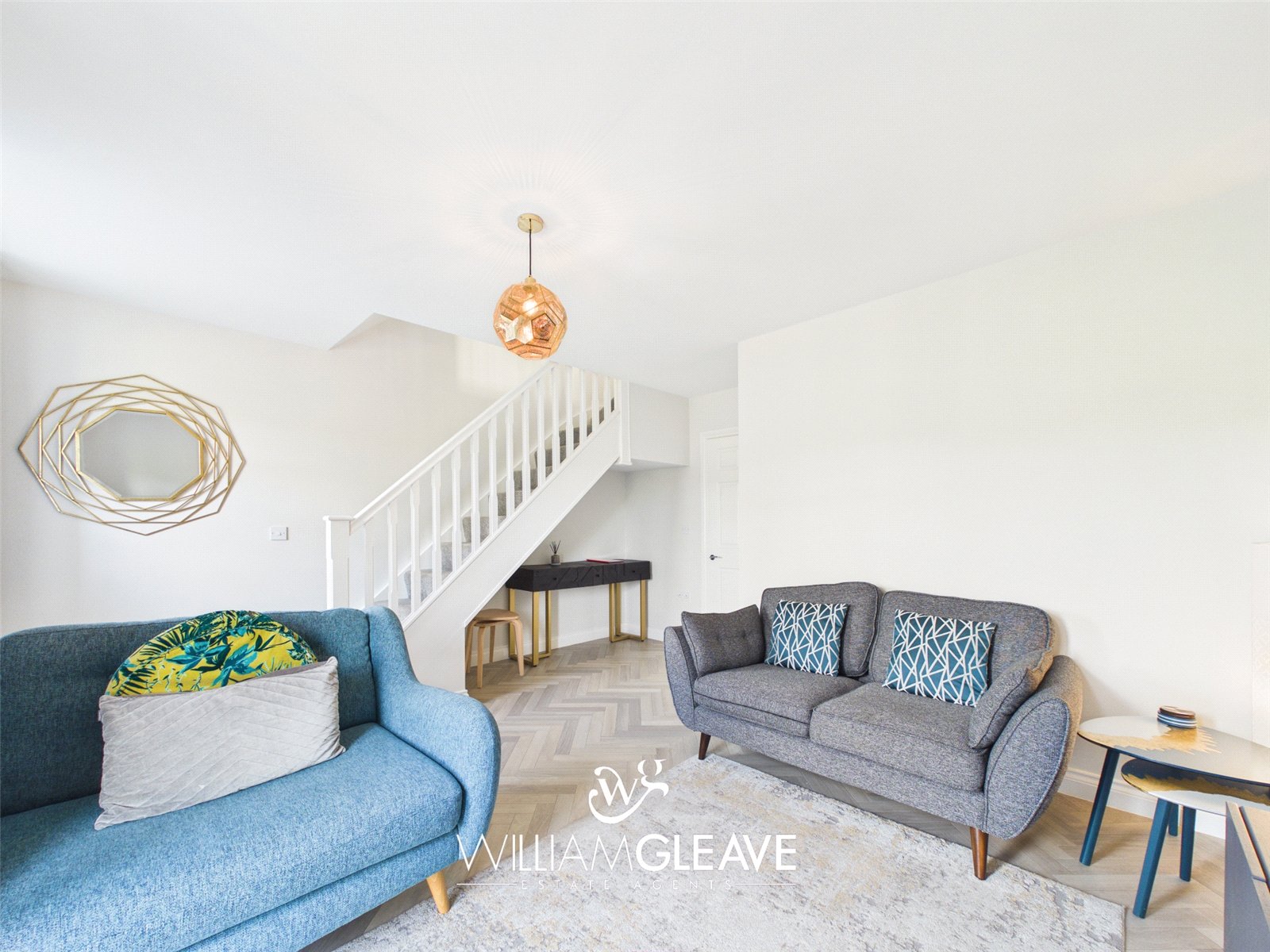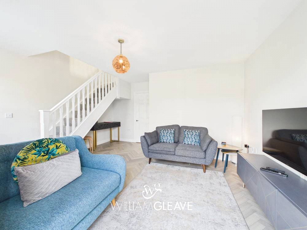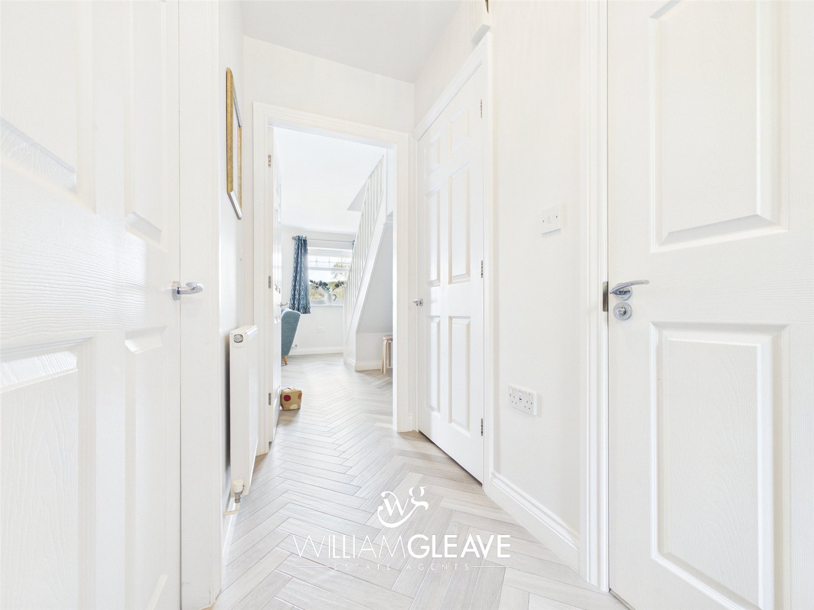 You enter the property through a composite PVC frosted door into the hallway, which provides access to a storage cupboard, the downstairs WC, the kitchen, and the living space. The hallway also includes a radiator and power point.