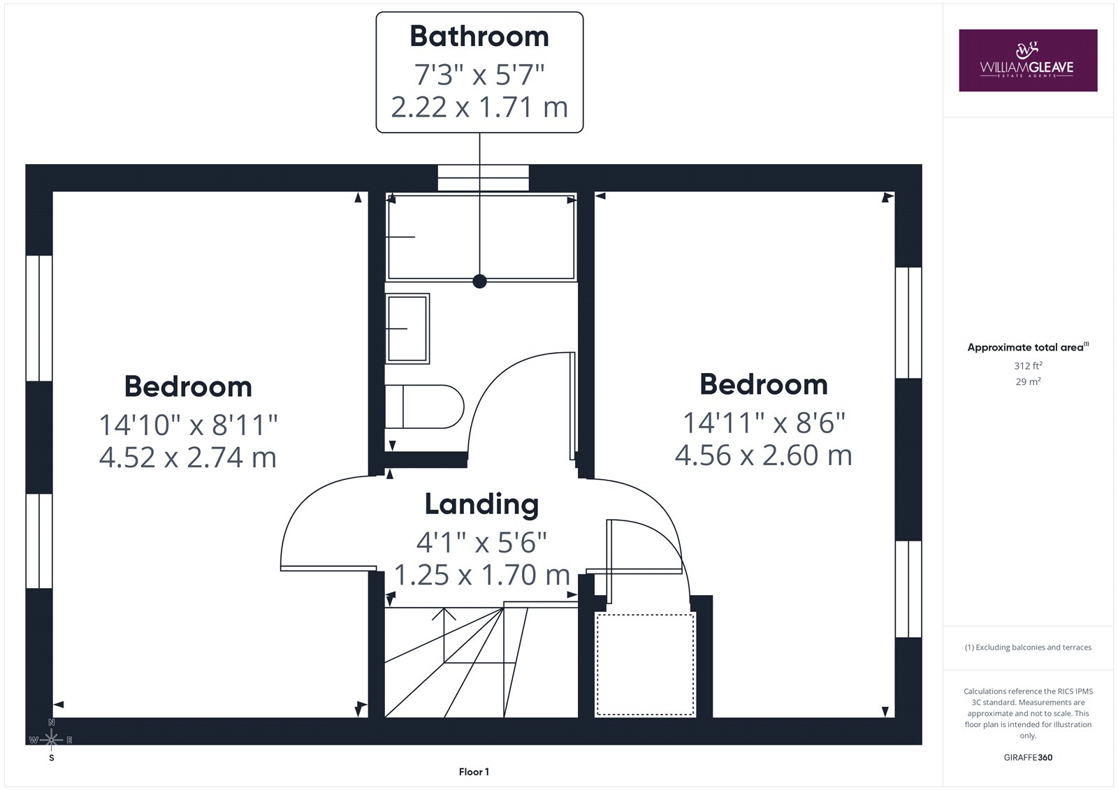 The landing provides access to both bedrooms and the loft, which has pull-down ladder access. It also leads to the family bathroom and includes a radiator, power point, and carpeted flooring.