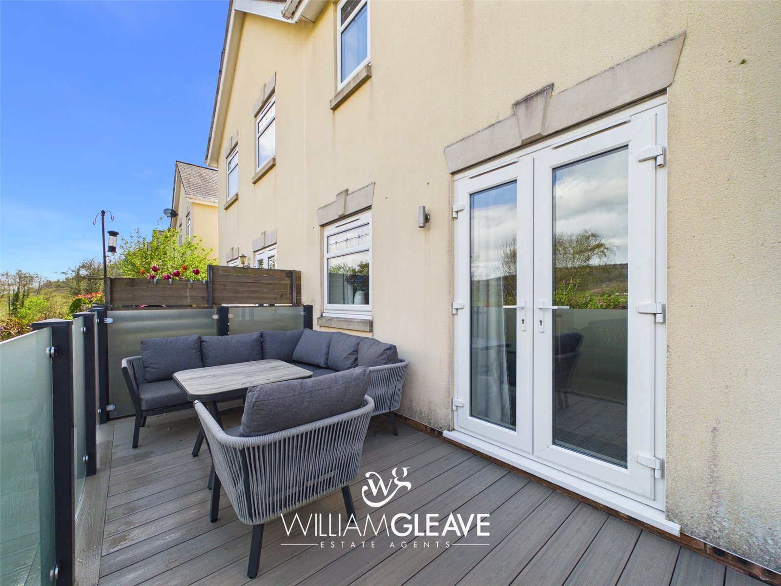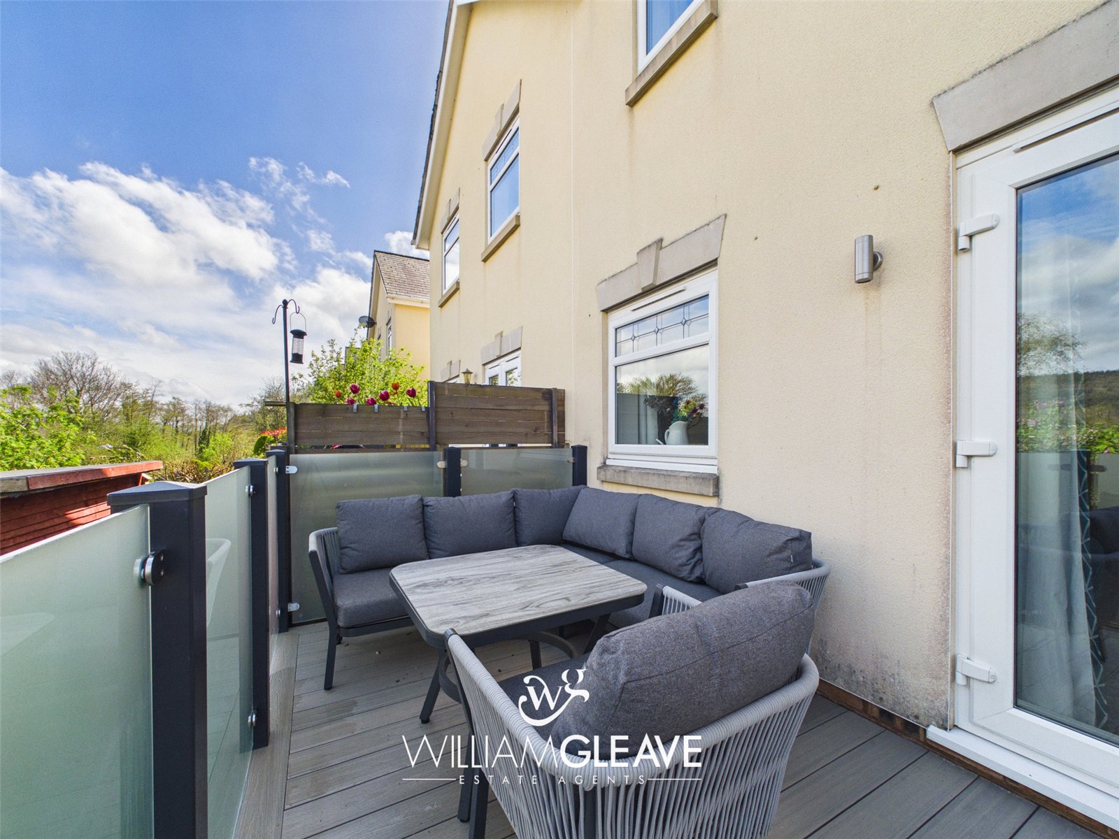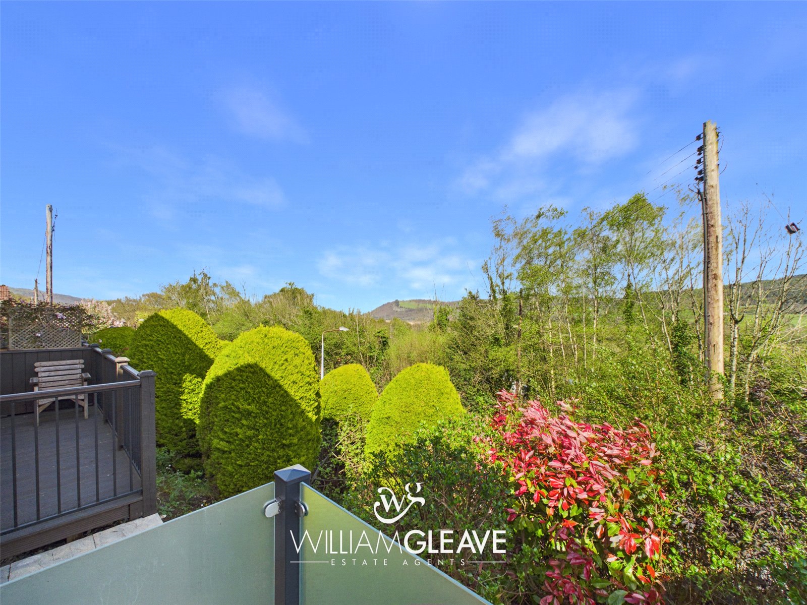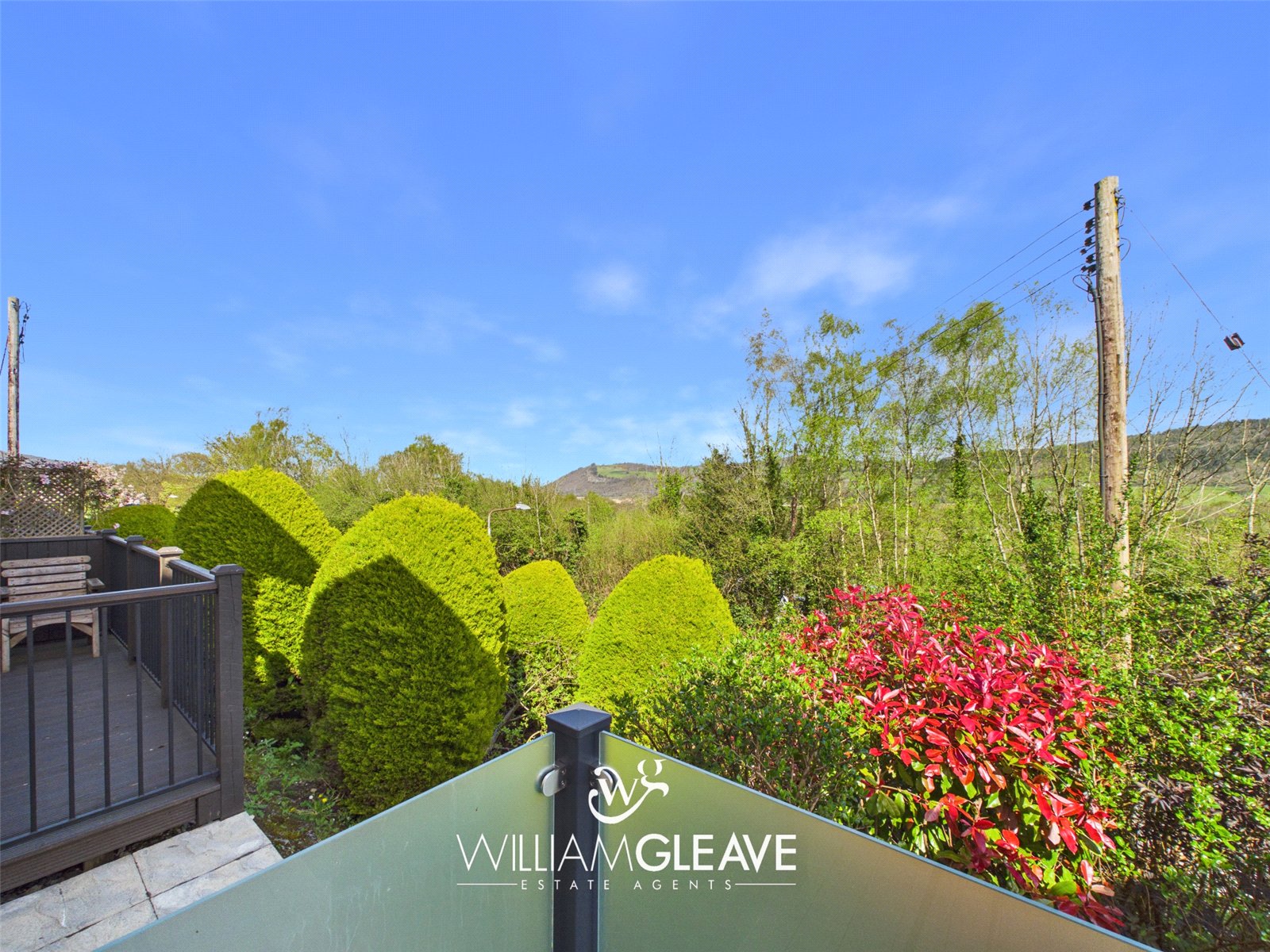 To the front of the property, there is a gravelled area with a paved pathway leading to the front door. The front garden is accessed via a wooden gate and is enclosed by wood-panelled fencing. The rear features composite decking bordered by a frosted glass balustrade, providing an ideal space for seating and entertaining. The garden also enjoys lovely distant views and includes an additional sloping area planted with mature shrubs and greenery.