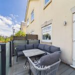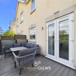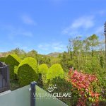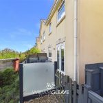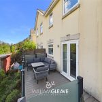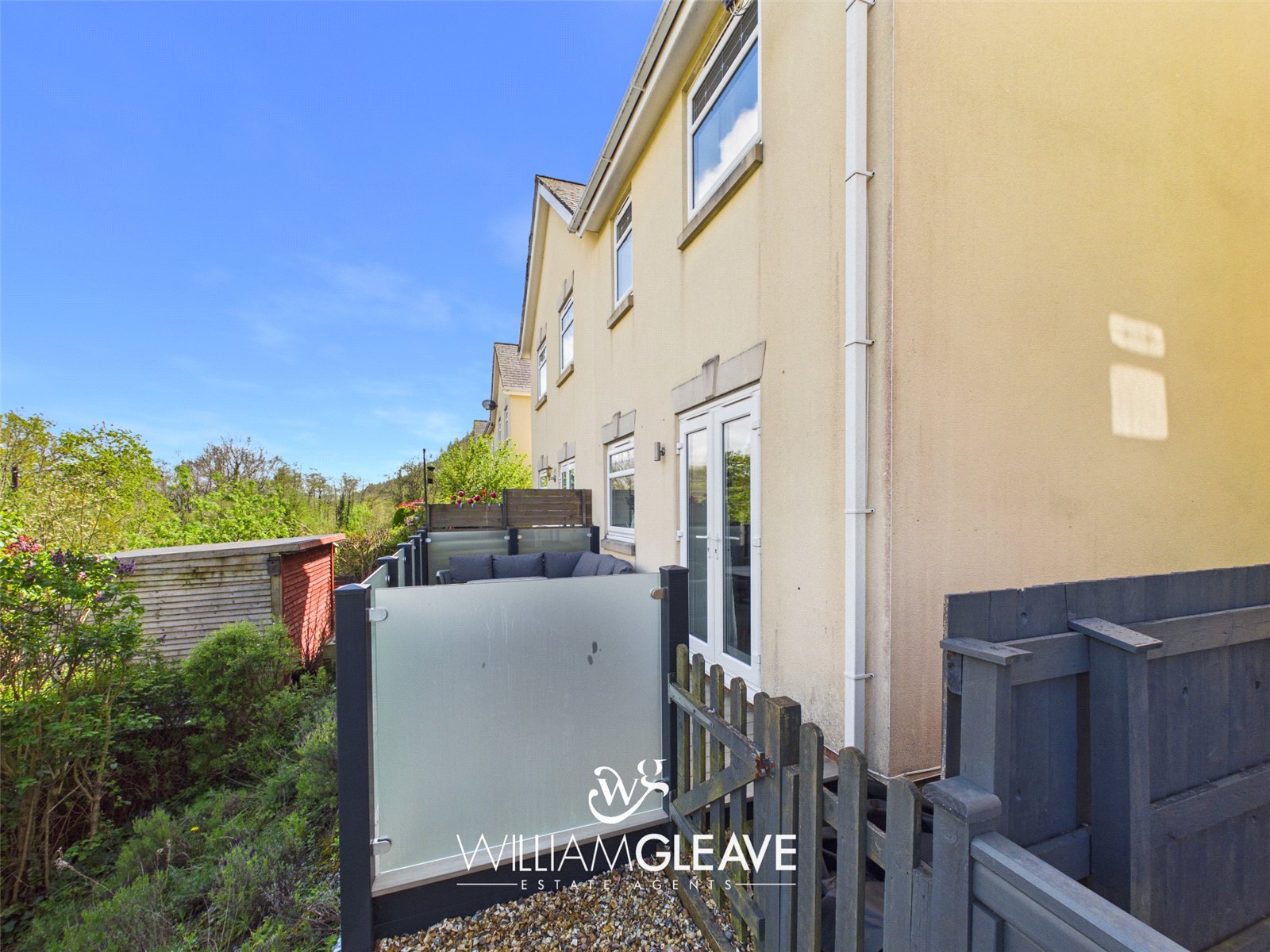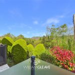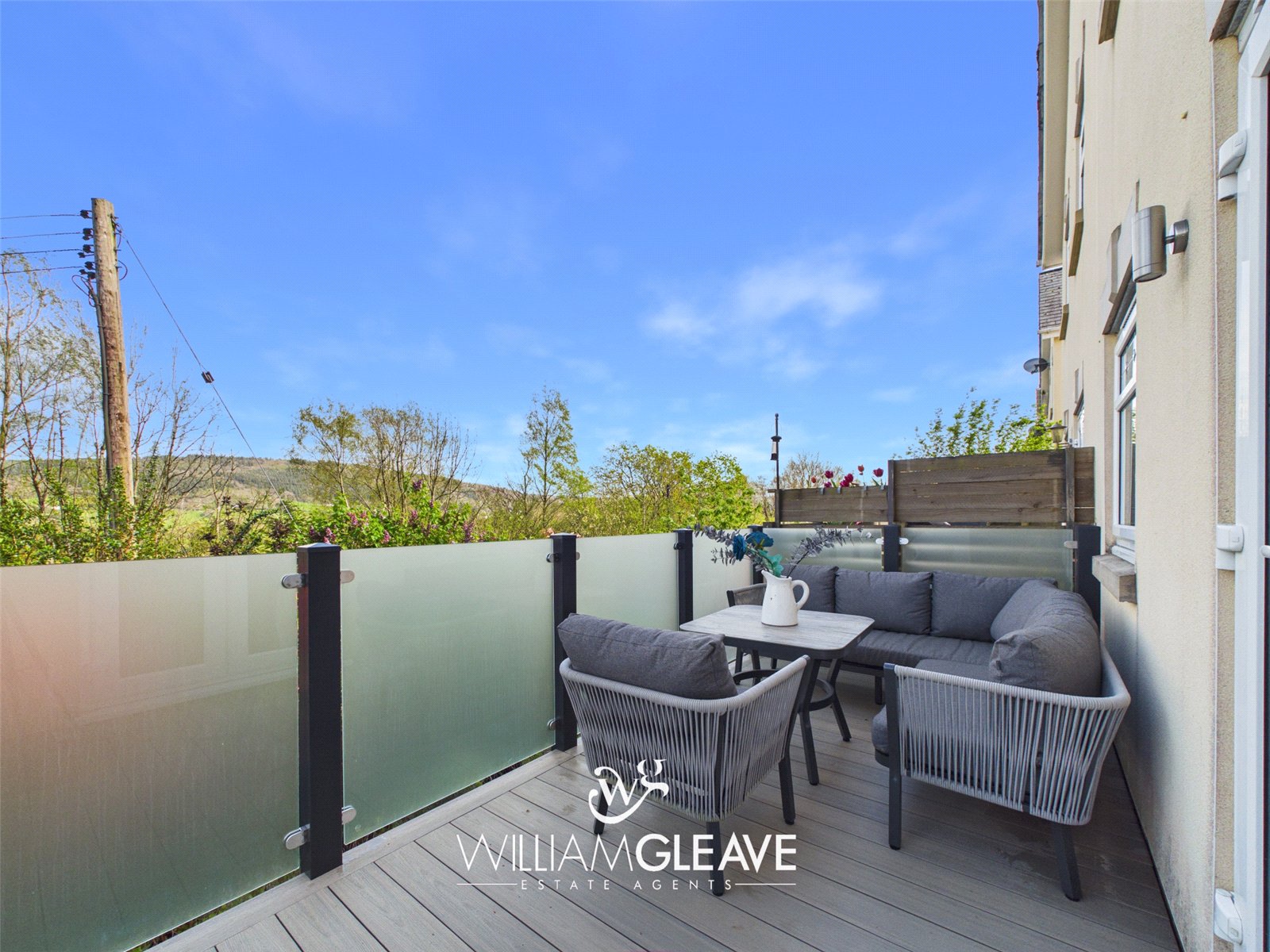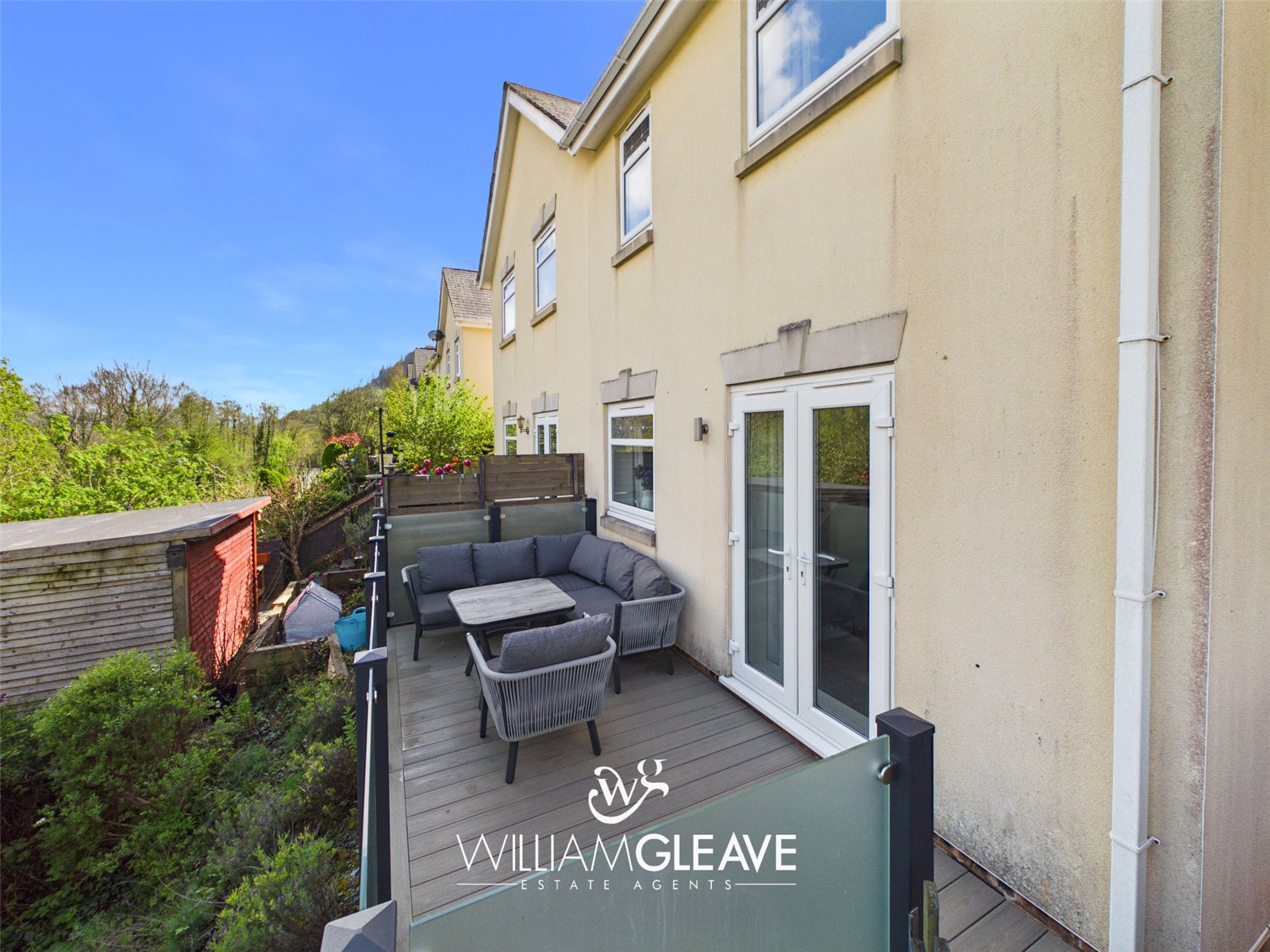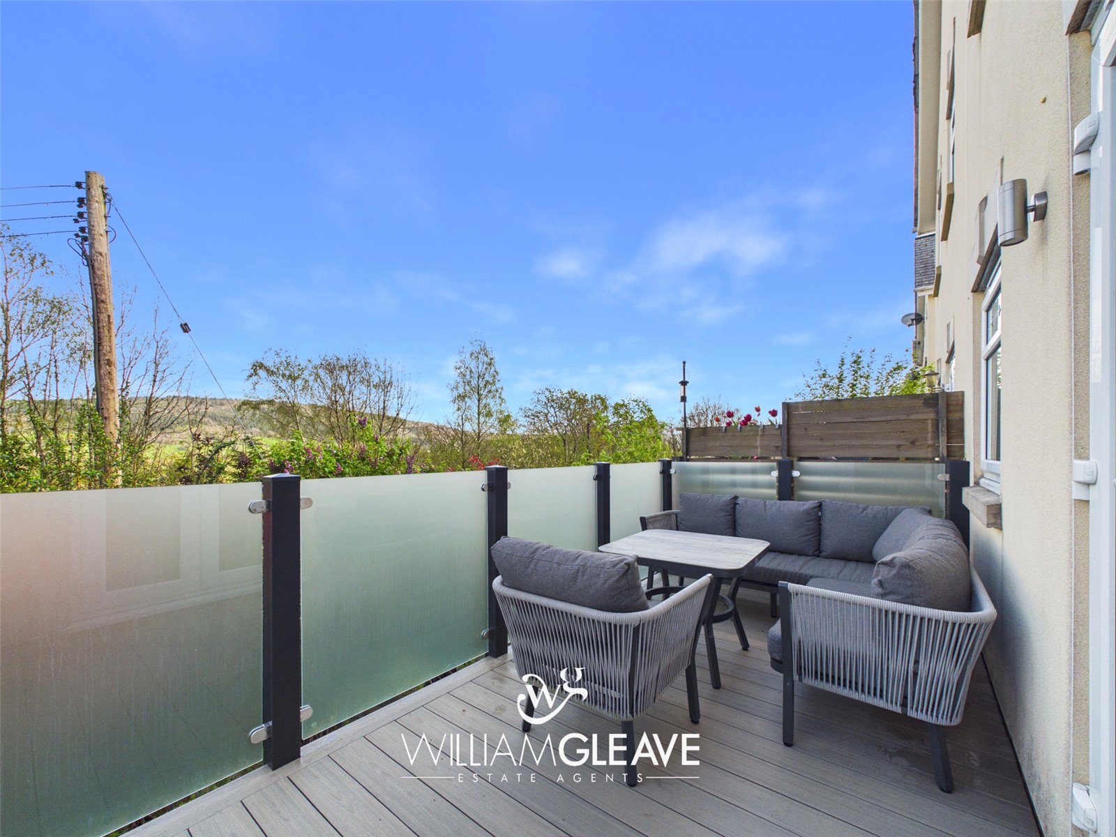 To the front of the property, there is a gravelled area with a paved pathway leading to the front door. The front garden is accessed via a wooden gate and is enclosed by wood-panelled fencing. The rear features composite decking bordered by a frosted glass balustrade, providing an ideal space for seating and entertaining. The garden also enjoys lovely distant views and includes an additional sloping area planted with mature shrubs and greenery.