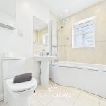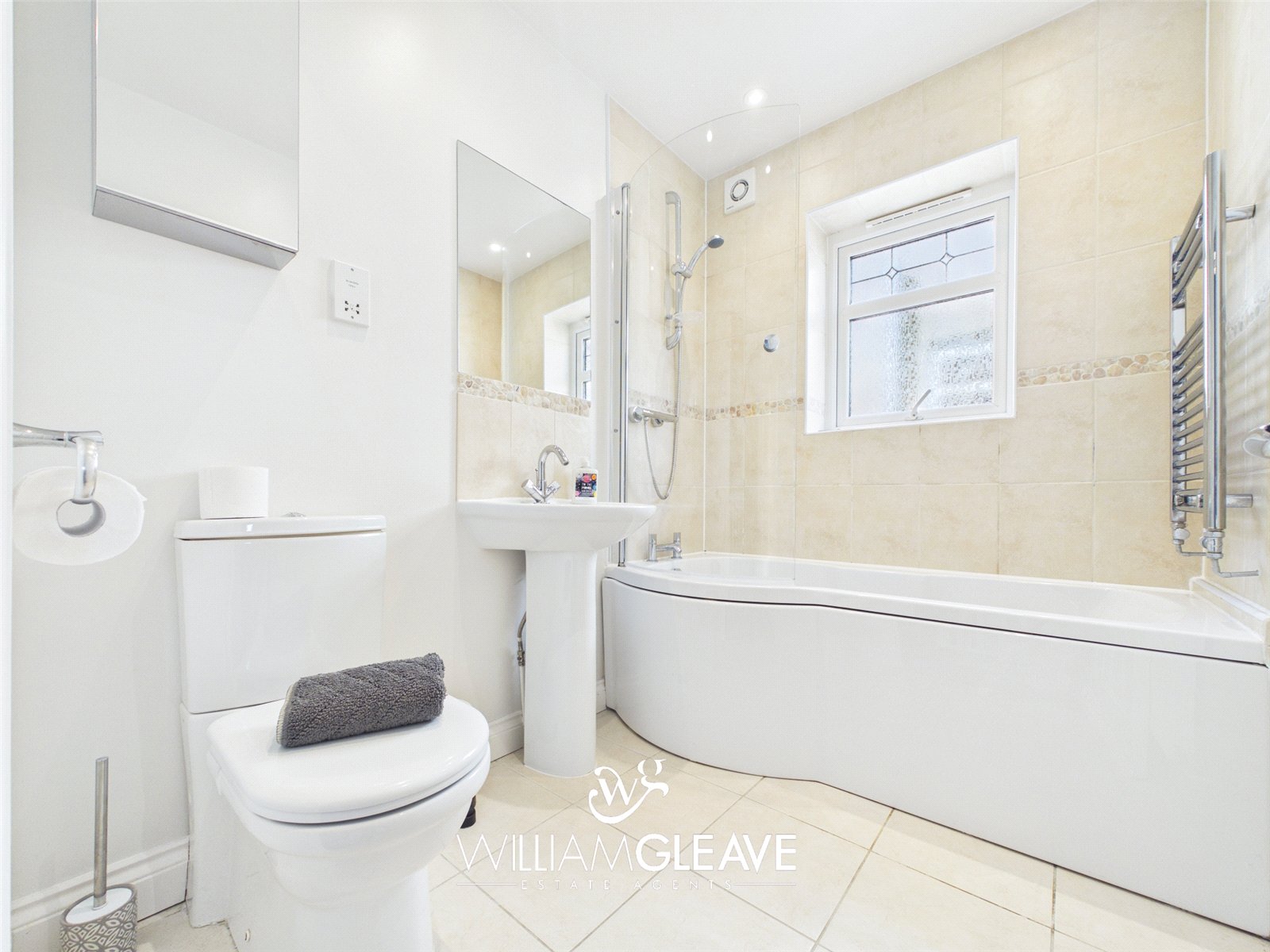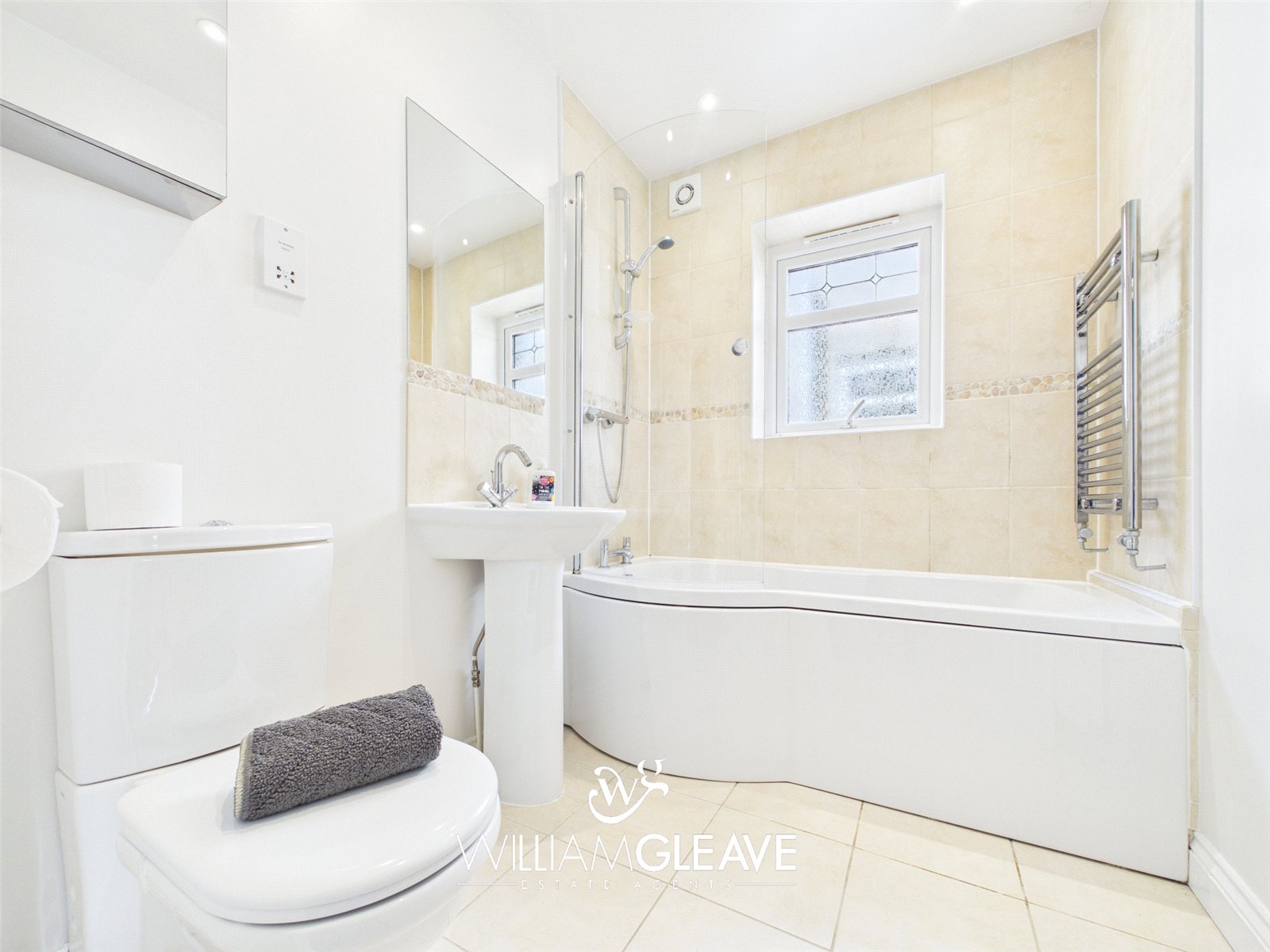 The family bathroom includes a low-level WC and a pedestal wash hand basin with a stainless-steel tap, tiled splashback, and a mirror above. There is also a separate panelled bath fitted with a stainless-steel mixer tap and a wall-mounted mains-powered shower. A frosted double-glazed window on the side elevation provides natural light. The room is finished with part-tiled walls, a heated chrome towel rail, a radiator, and tiled flooring.
