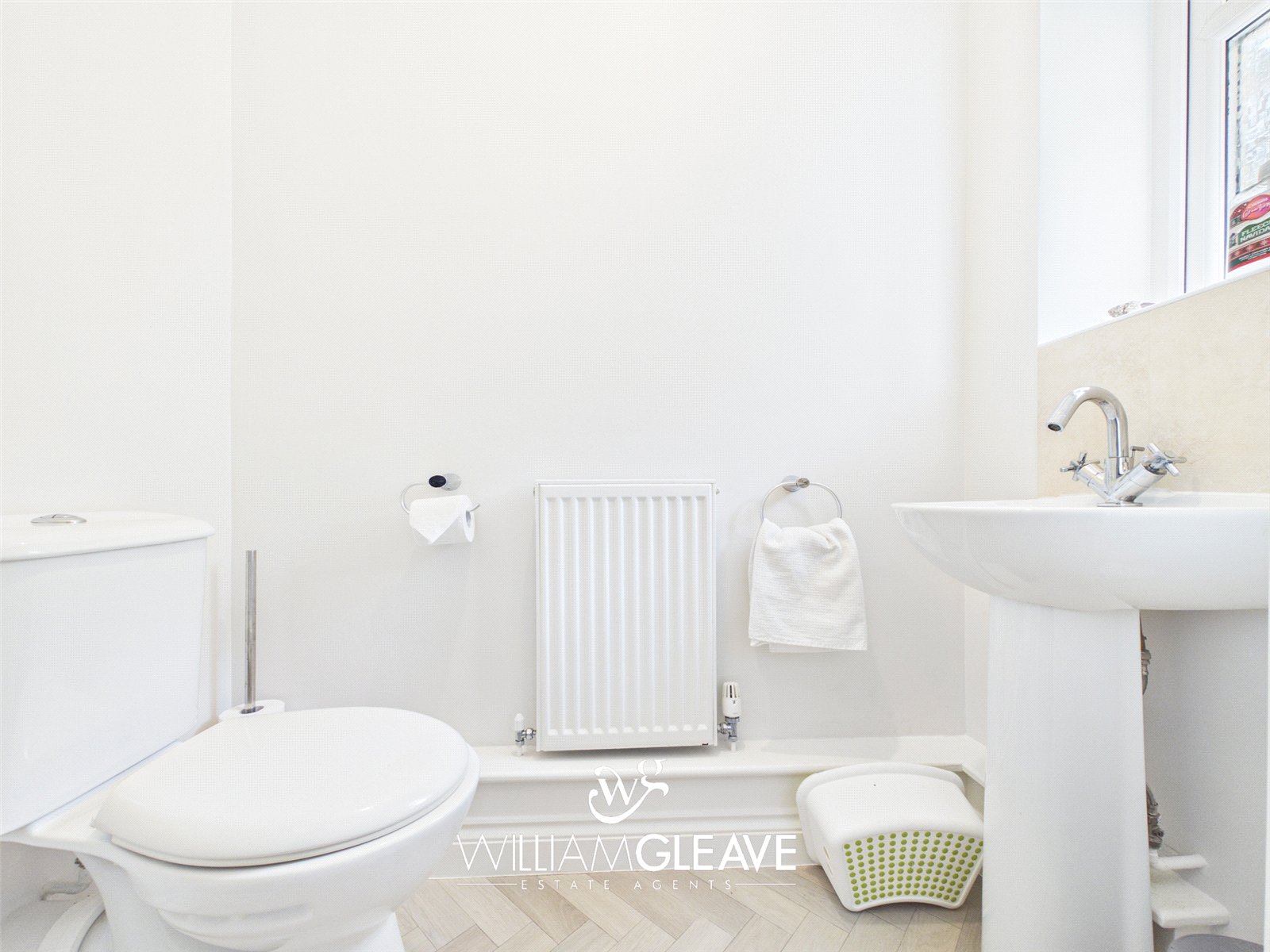 The downstairs WC features a low-level toilet and a pedestal wash hand basin with a stainless-steel mixer tap and tiled splashback. A frosted double-glazed window provides natural light, and the room is finished with a radiator and herringbone style flooring.