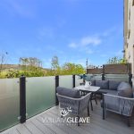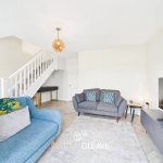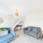 The living room is a generous space located at the rear of the property. It features a double-glazed window and two patio doors that open out onto the balcony. The room includes ample power points, a TV point, and useful storage space beneath the stairs. The staircase also leads up to the first floor.