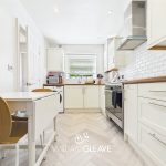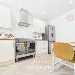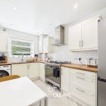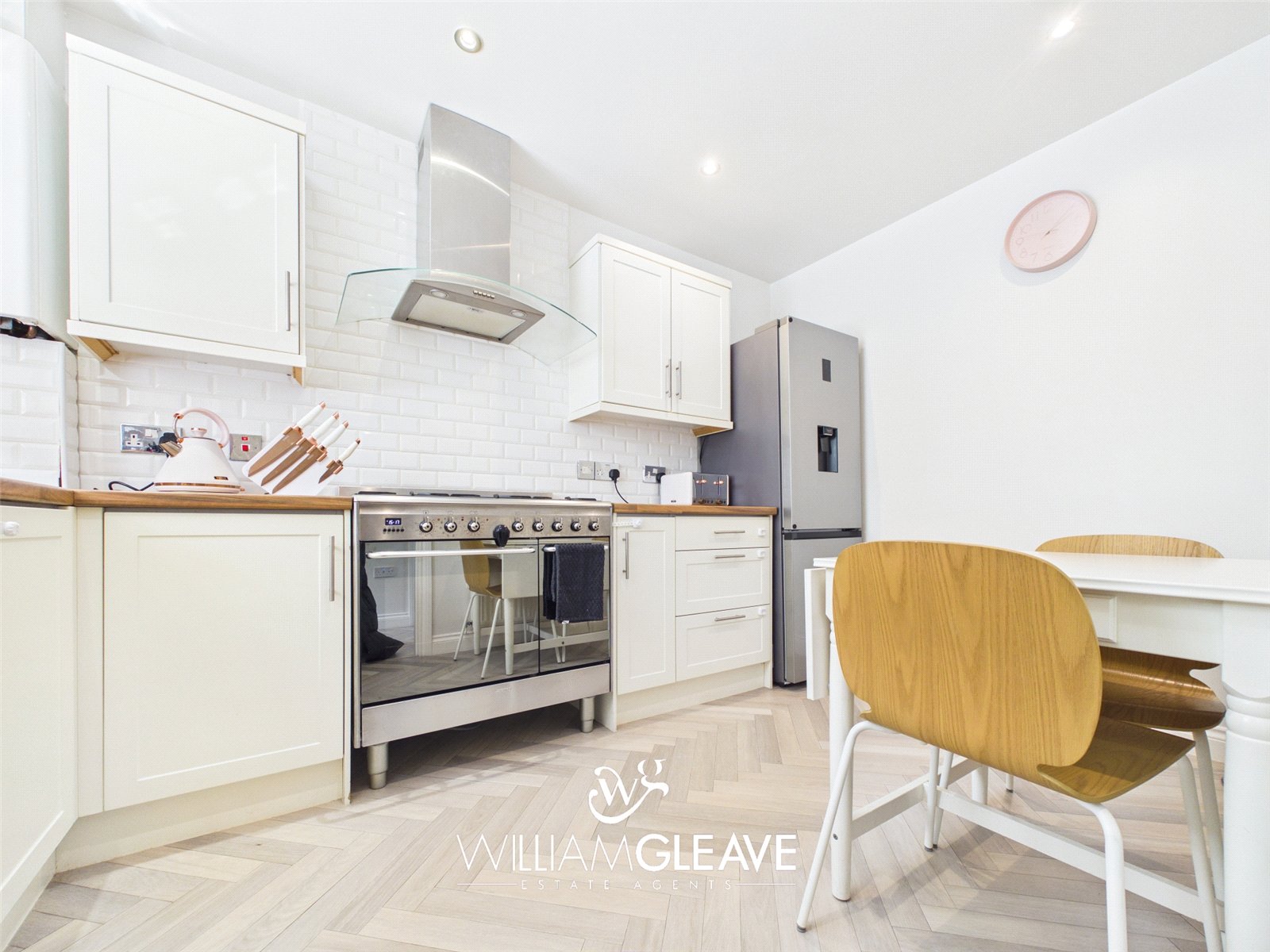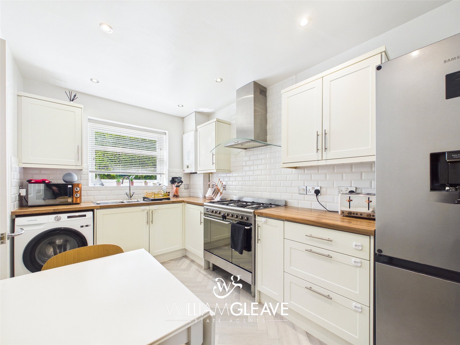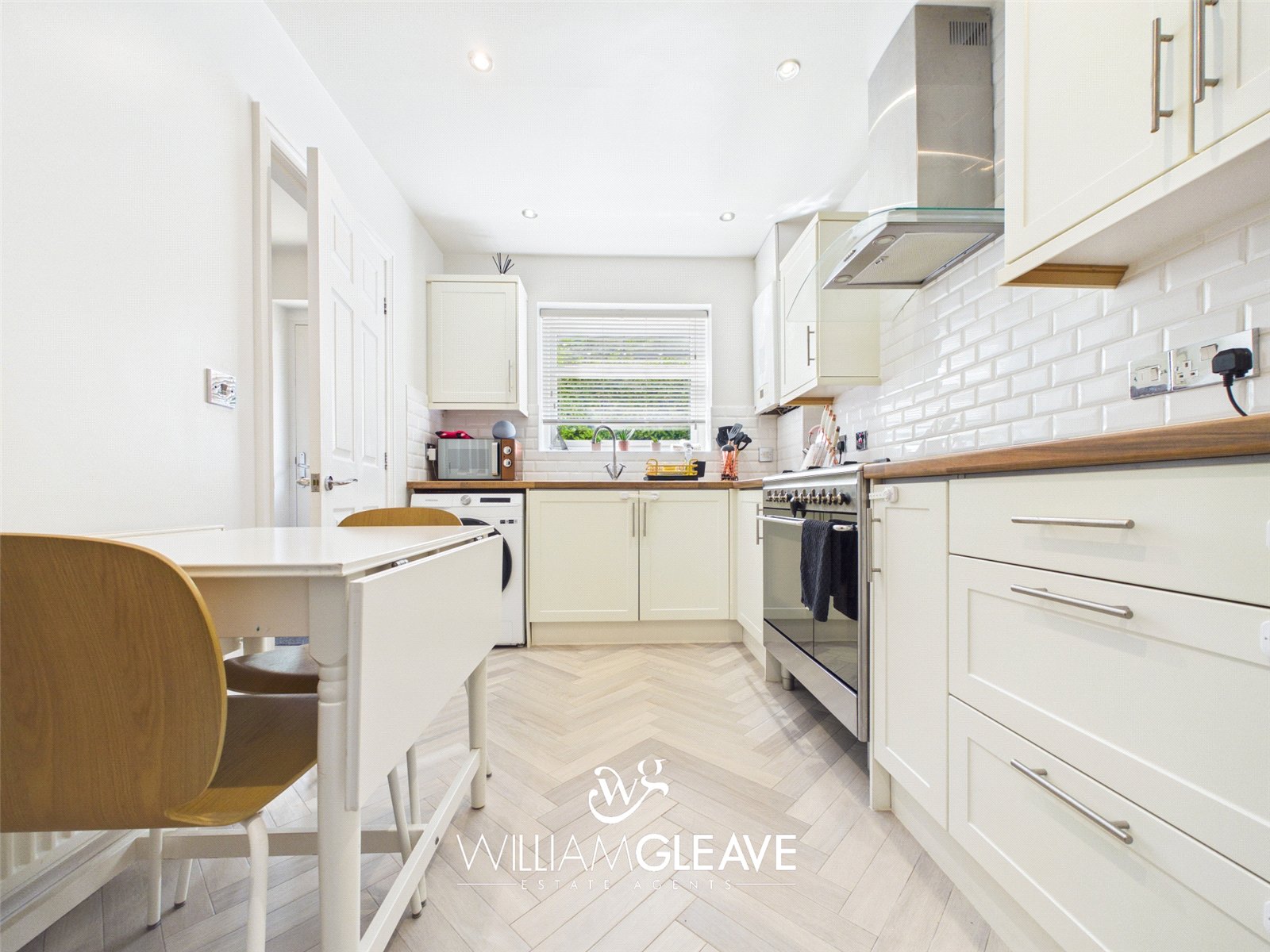 The kitchen is fitted with a range of wall and base units and includes an inset stainless-steel one-and-a-half bowl sink with drainer and mixer tap. There is space for essential appliances, including a gas cooker with an integrated stainless-steel extractor, space for a washing machine, and a fridge-freezer. The room also offers enough space for a small dining table. Additional features include power points, a radiator, and a double-glazed window on the front elevation.