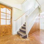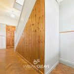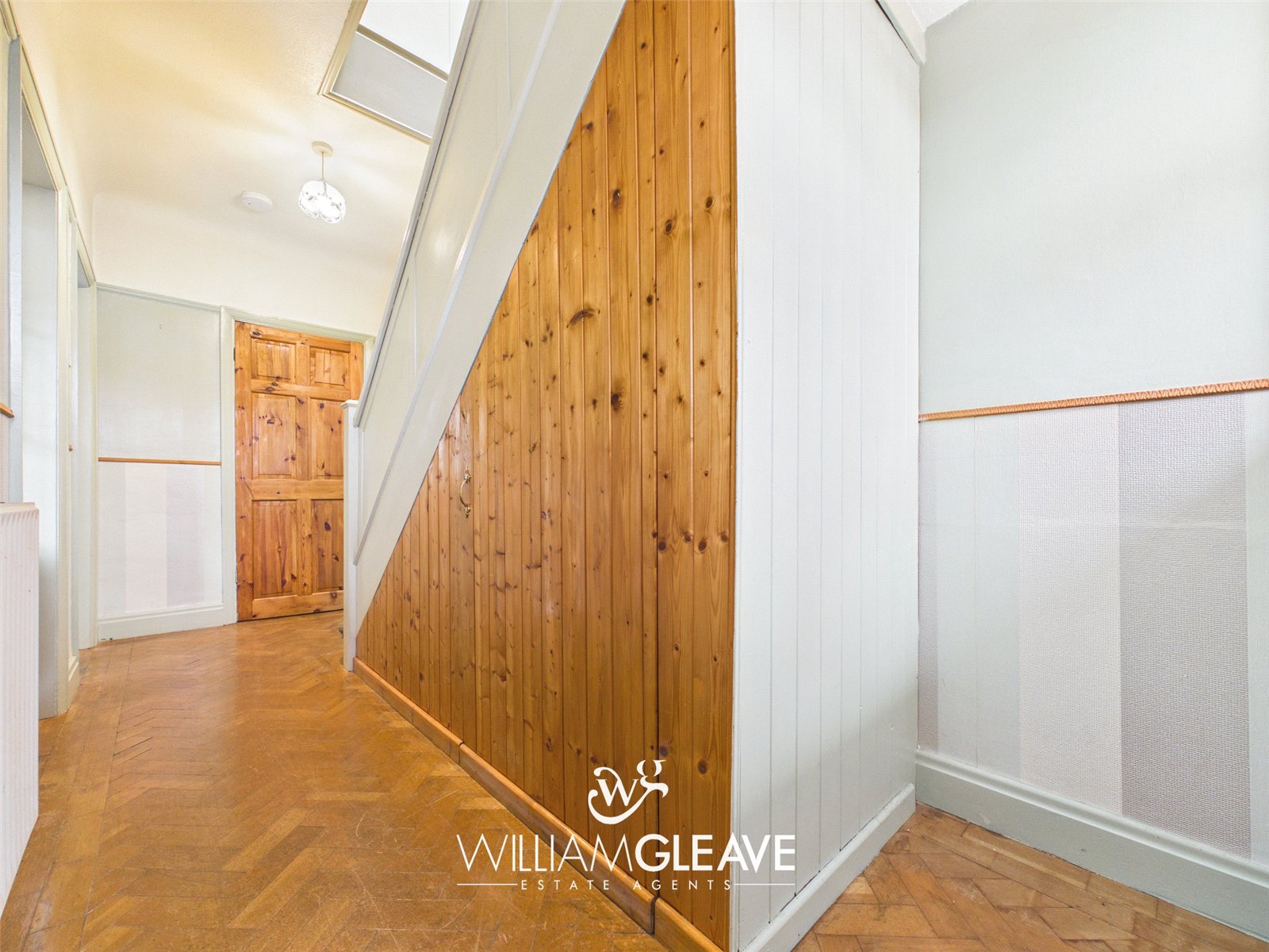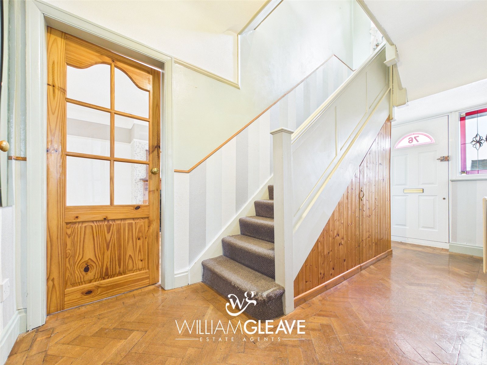 Double-glazed entrance door with decorative coloured glass side panels, opening into a welcoming entrance hall. Features include a radiator, attractive parquet flooring, and partially panelled walls. Stairs rise to the first floor with useful under-stairs storage, and doors lead to the principal ground floor rooms.