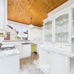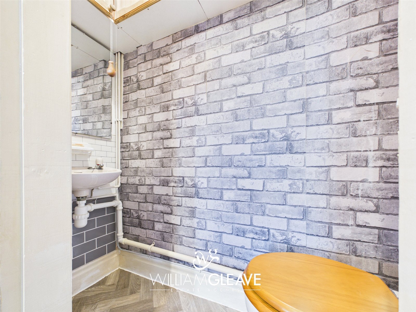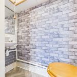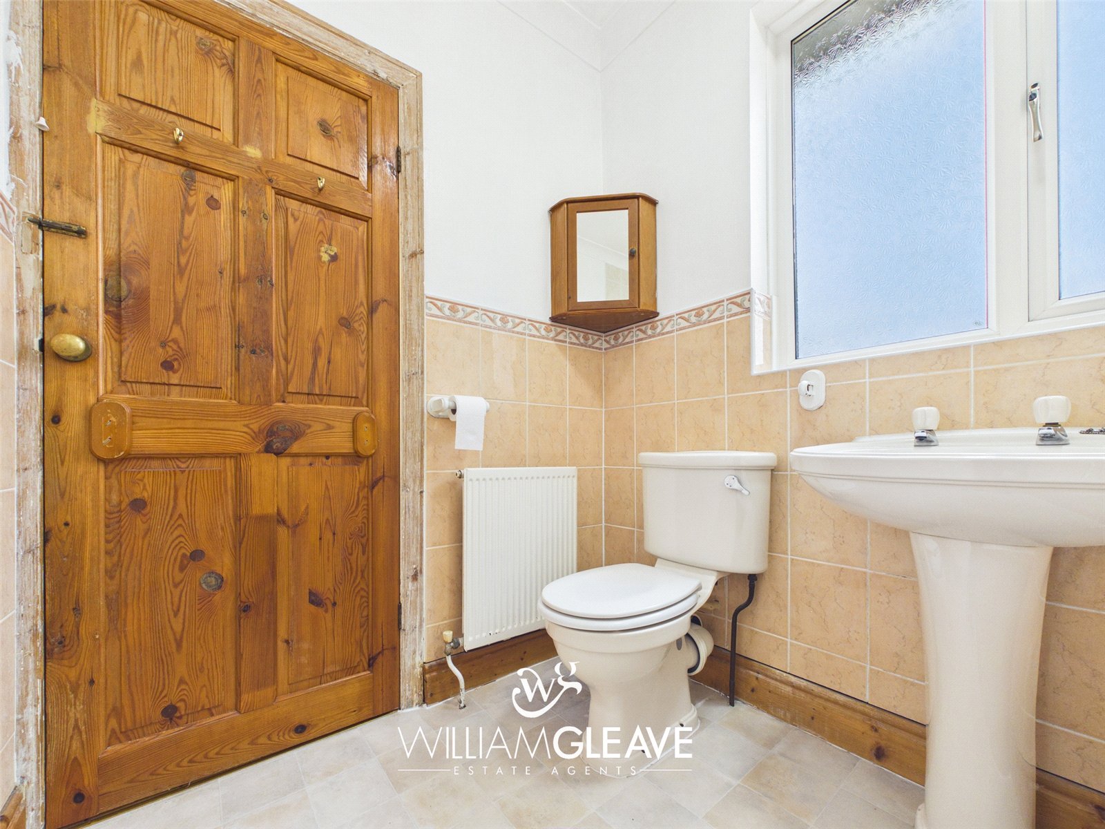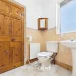 Featuring a low-level WC and a wall-mounted wash hand basin, this practical space also includes built-in storage cupboards, providing convenient room for essentials.