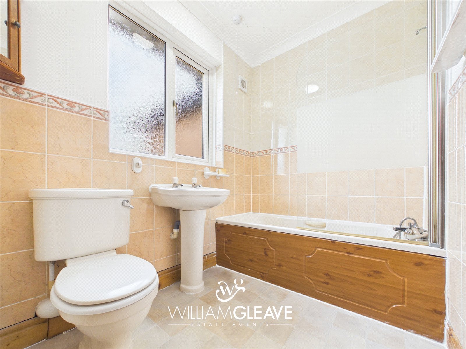 Featuring a panelled bath with a glass shower screen, stainless steel mixer taps, and a handheld shower attachment, this well-appointed bathroom also includes a low-level WC and a pedestal wash hand basin. Part-tiled walls, radiator, double-glazed frosted window, and extractor fan.