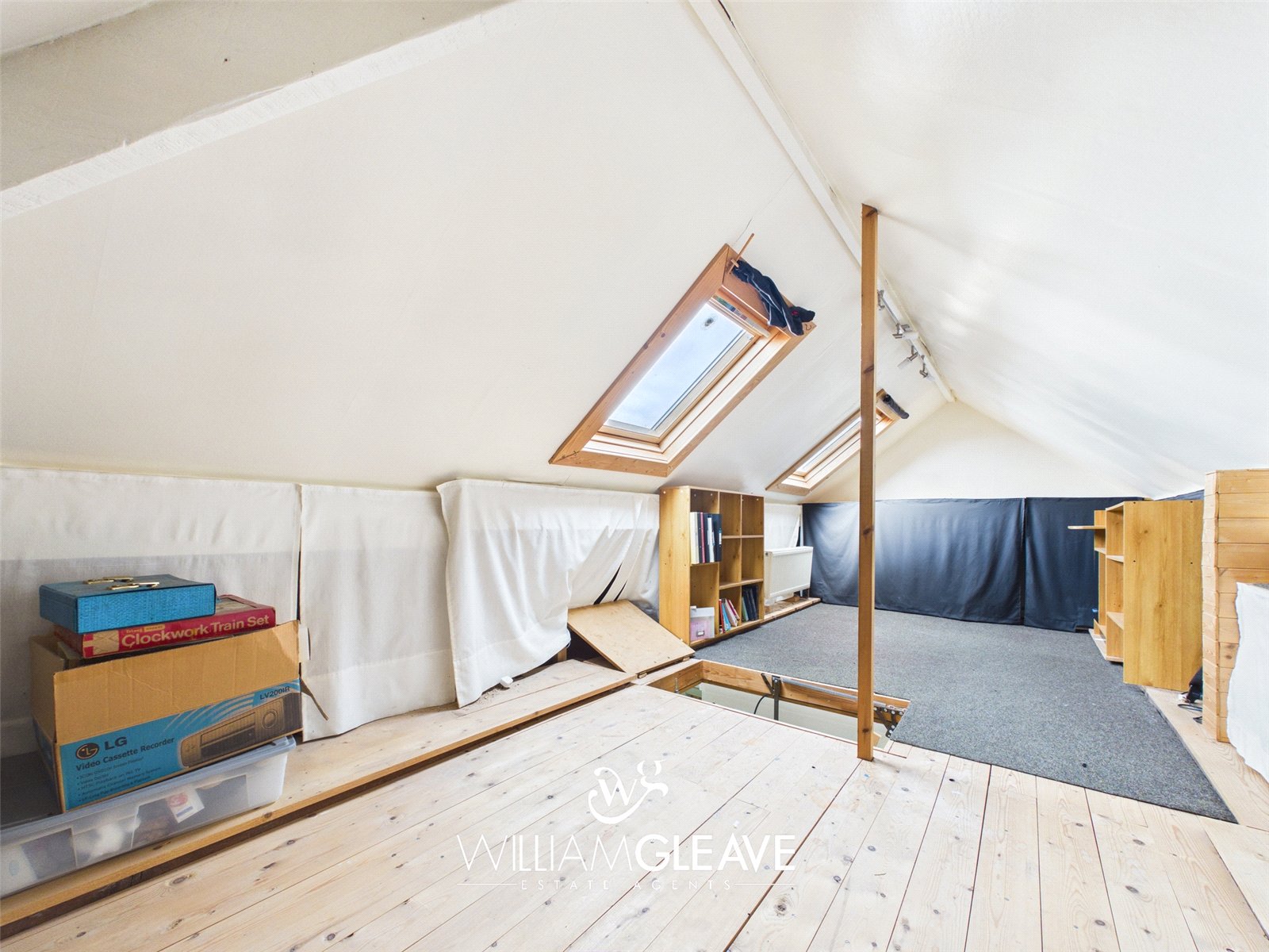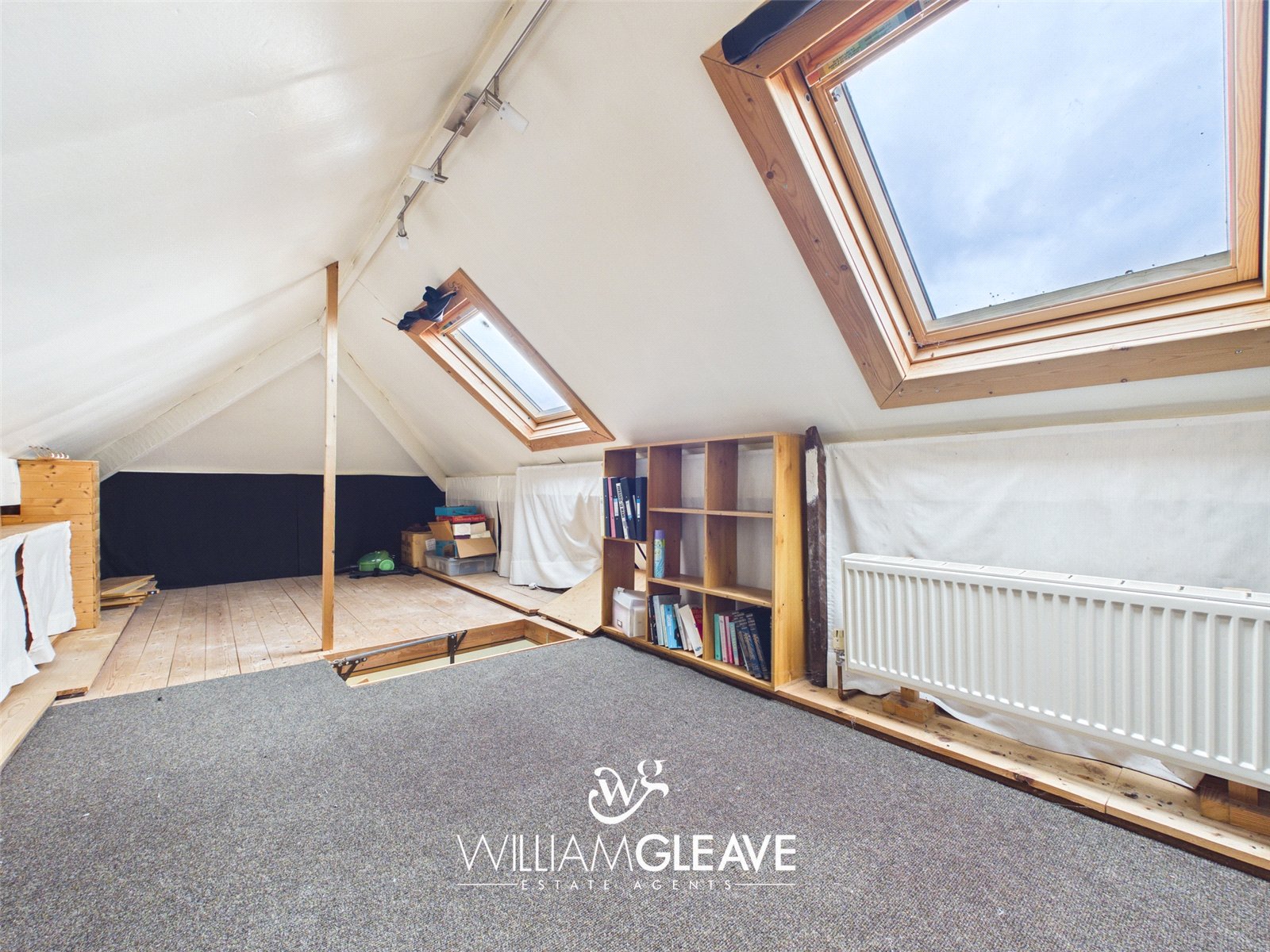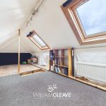A versatile space, fully boarded and fitted with a radiator, lighting, and power points. Two Velux windows fill the room with natural light, and there is ample storage integrated within the eaves.