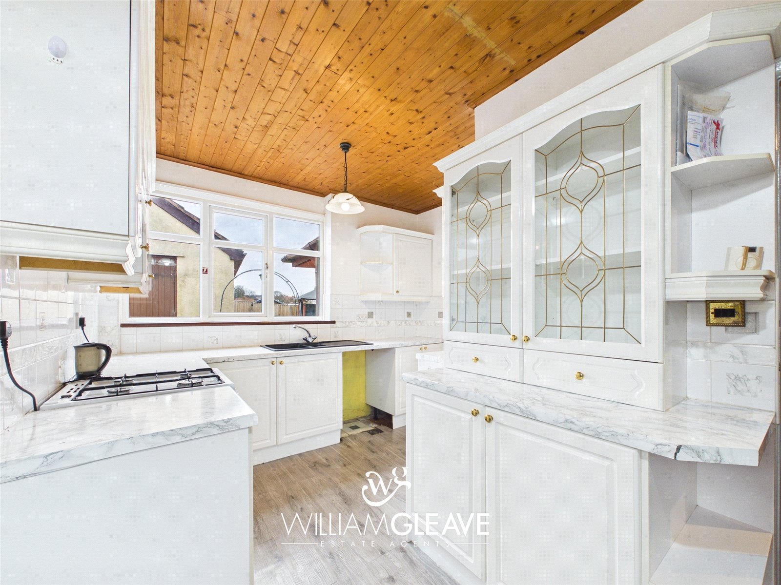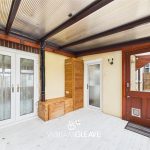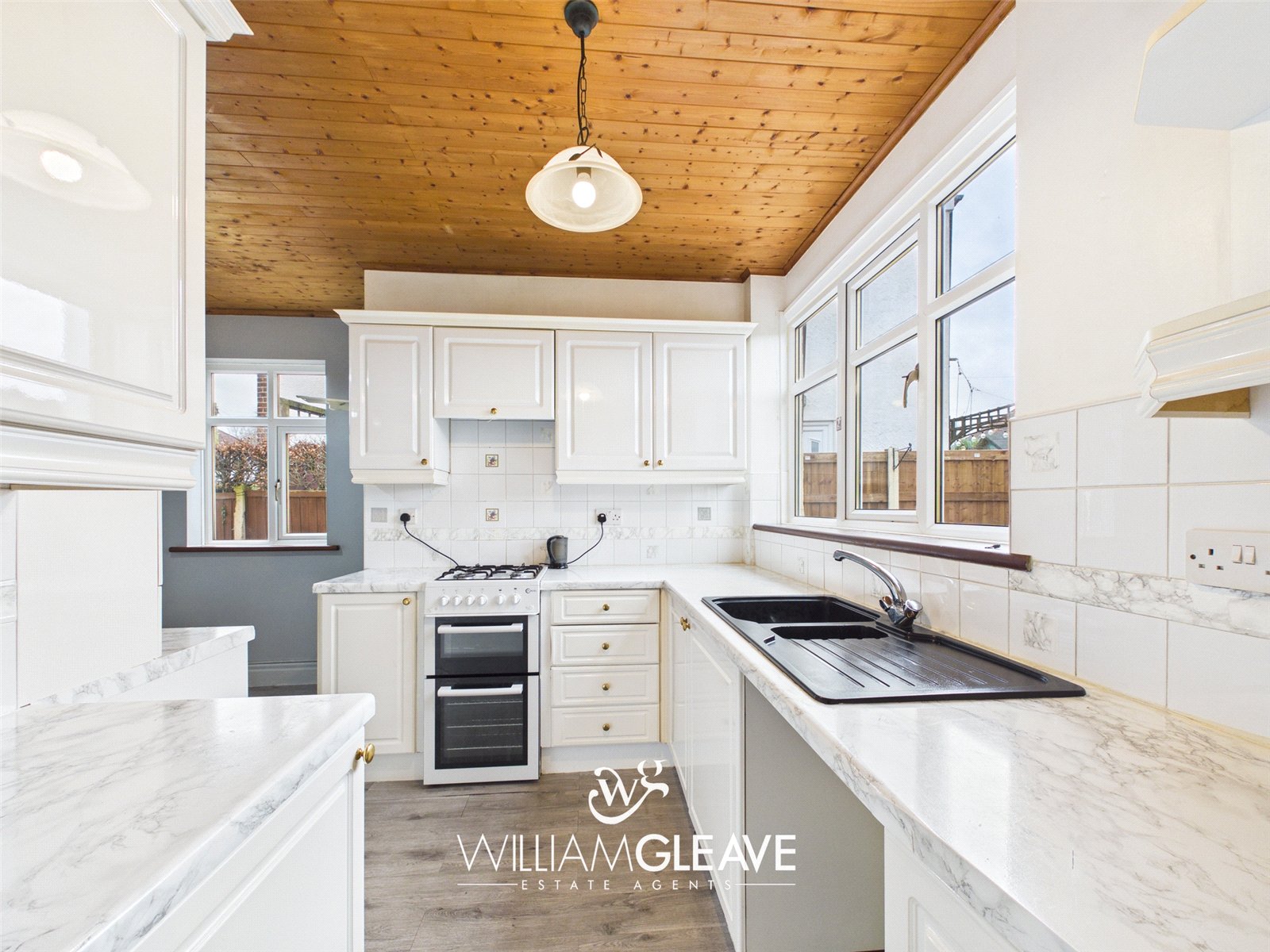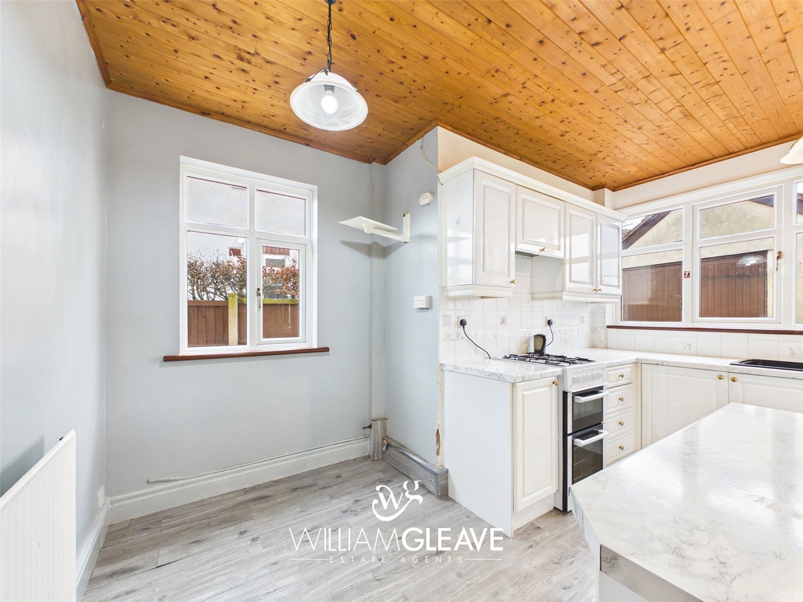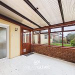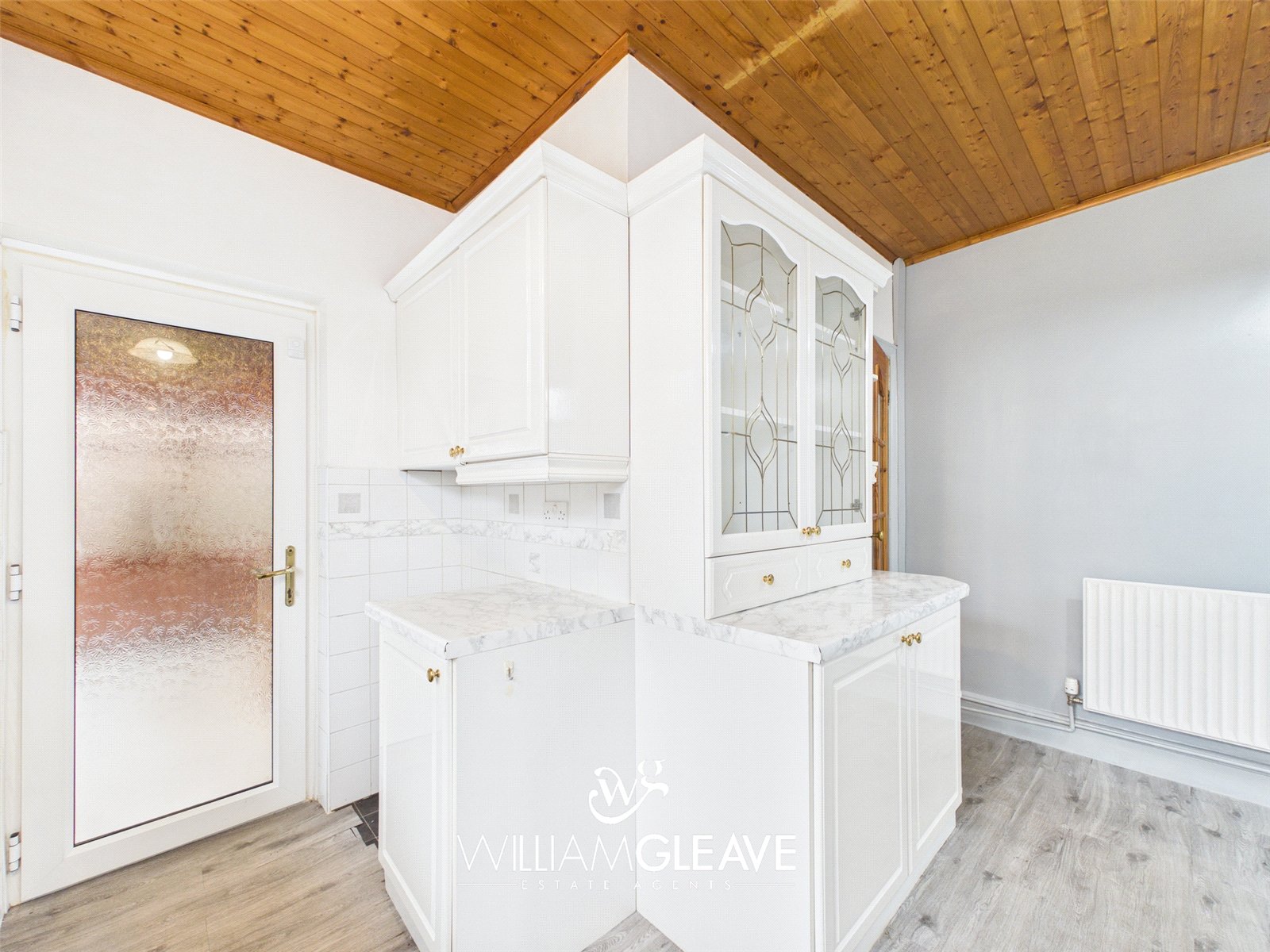 This bright space is fitted with a range of white gloss wall and base units, paired with marble-effect worktops. The kitchen features an inset sink with a one-and-a-half drainer and a stainless-steel mixer tap, plus convenient space for appliances. Partially tiled wall with a double-glazed window to the side elevation. Additional practical features include a radiator and multiple power points. A double-glazed frosted door provides access to the conservatory, and there is ample room for a dining table.