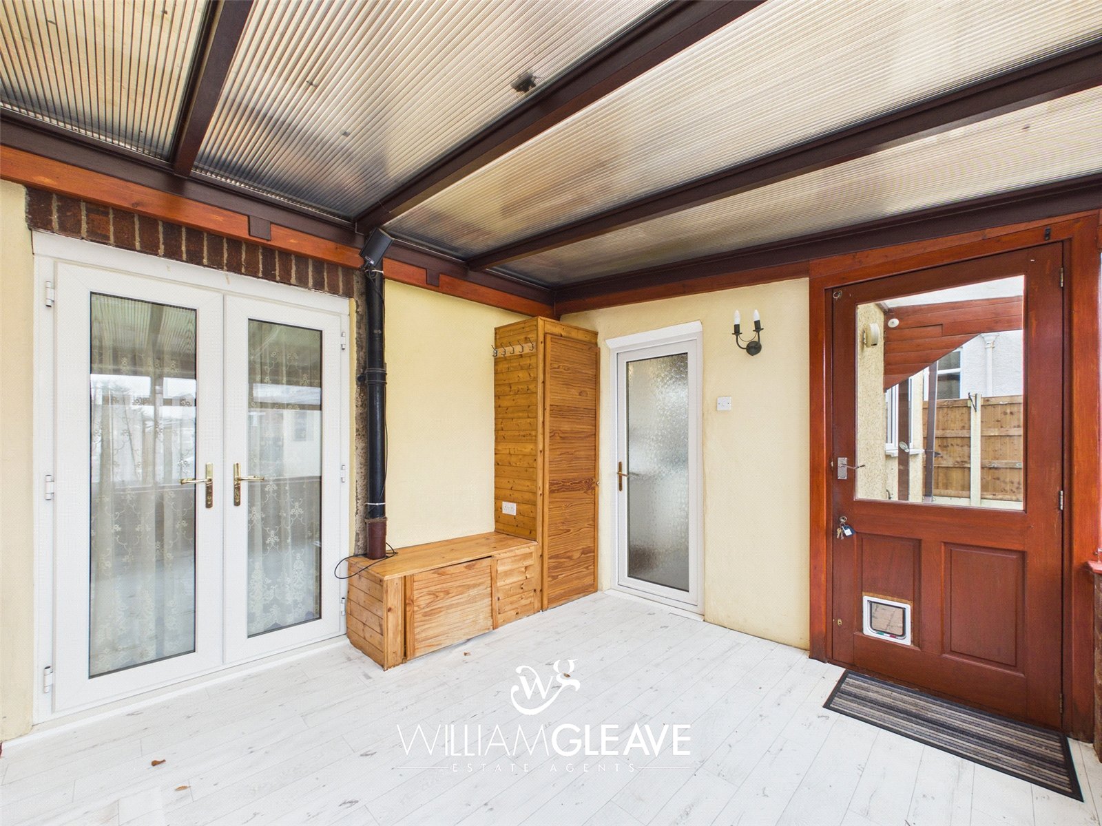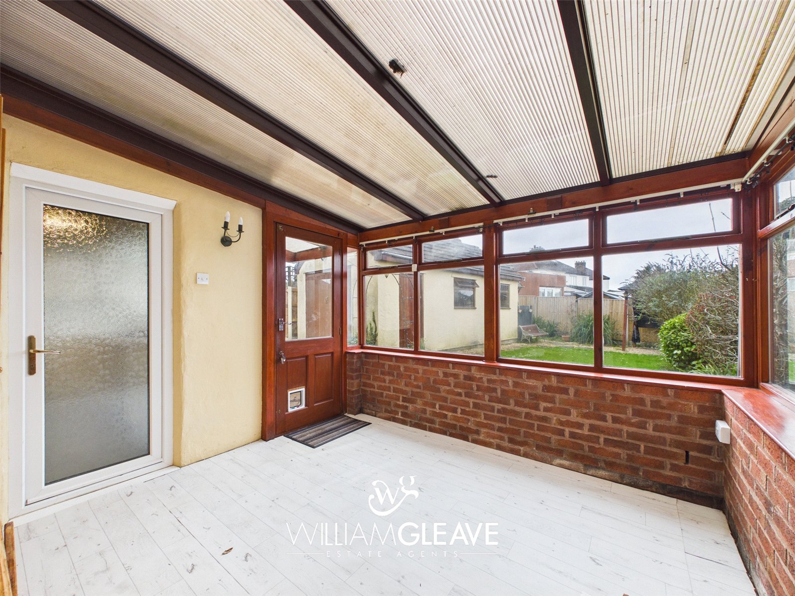 Double-glazed windows to the rear and side elevations set on a low-rise brick base, with a polycarbonate roof allowing for plenty of natural light. Features include built-in storage cupboards, power points, and a glazed door providing access to the garden.