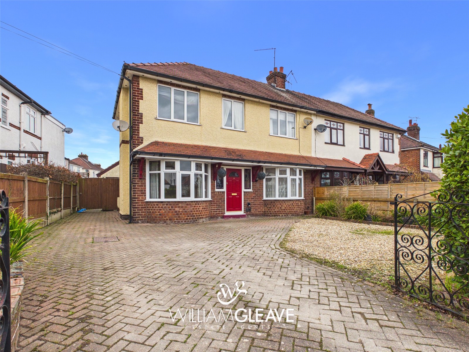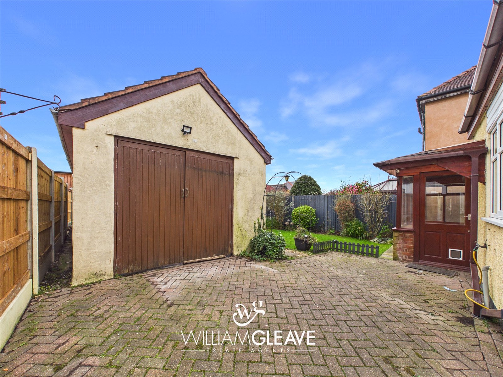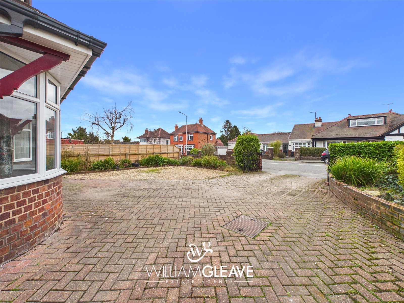 Front - The property features a block-paved driveway leading to the side and onward to the detached garage, with an additional gravel area providing extra parking. Borders of established flowers and shrubs enhance the frontage, which is enclosed by a low-rise brick wall and accessed via a wrought iron gate.