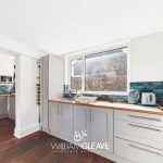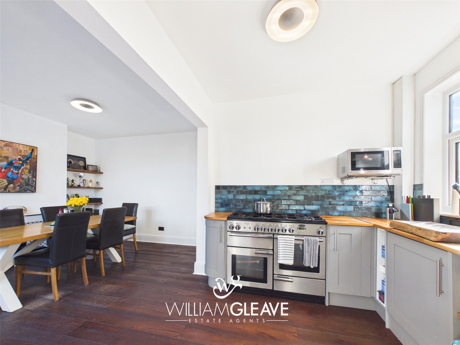 Open-plan and newly installed, this space features stylish shaker-style base units with solid wooden worktops, a 1½ bowl sink with drainer and stainless-steel mixer spray tap, and a range cooker. There is an integrated washing machine and space for a large fridge-freezer. The room comfortably accommodates a dining table and benefits from a bay window to the rear elevation and a double-glazed window to the side elevation. Hardwood flooring runs throughout, complemented by a tall modern radiator, ample power points, and part-tiled walls. A double-glazed door provides direct access to the garden.