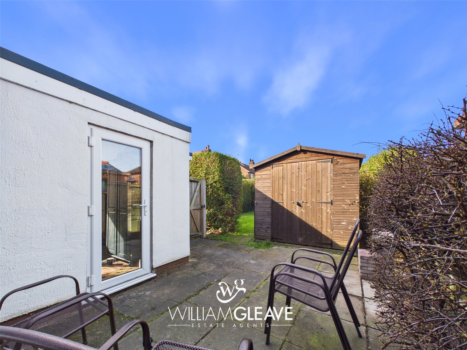 To the front, a newly laid block-paved driveway provides off-road parking for several vehicles and extends along the side of the property, leading to the rear garden. At the rear, there is a paved patio area with access to an outside store, as well as a large garden shed with an additional paved area behind it. The remainder of the garden is predominantly laid to lawn and enclosed by established bushes, offering a private and well-maintained outdoor space.