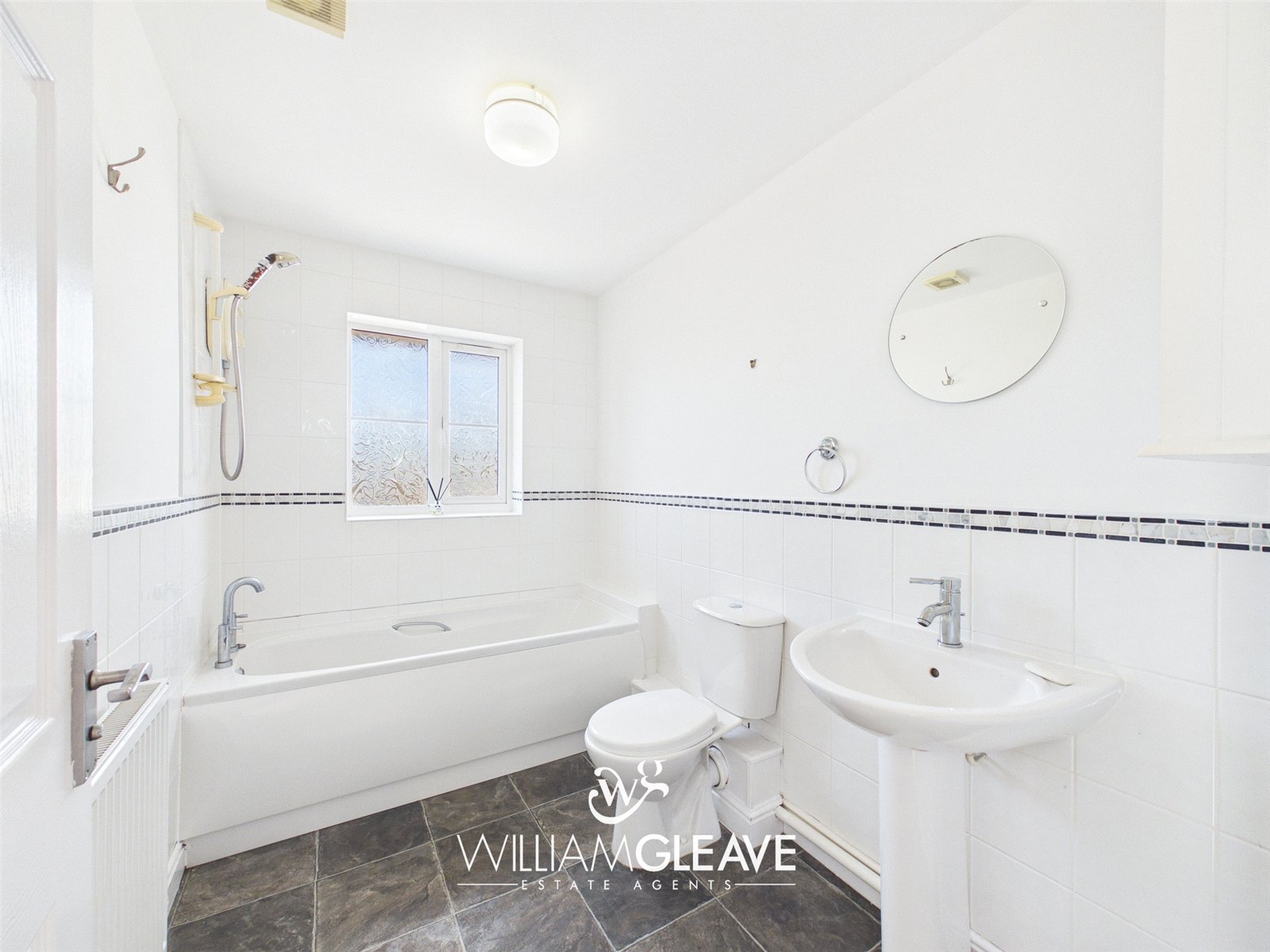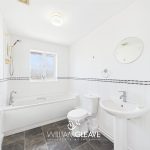 The bathroom is fitted with a three-piece suite comprising a panel-enclosed bath with handheld shower attachment, a wash hand basin with mixer tap, and a low flush WC. The walls are partially tiled, and there is a frosted window to the rear elevation, along with a radiator.