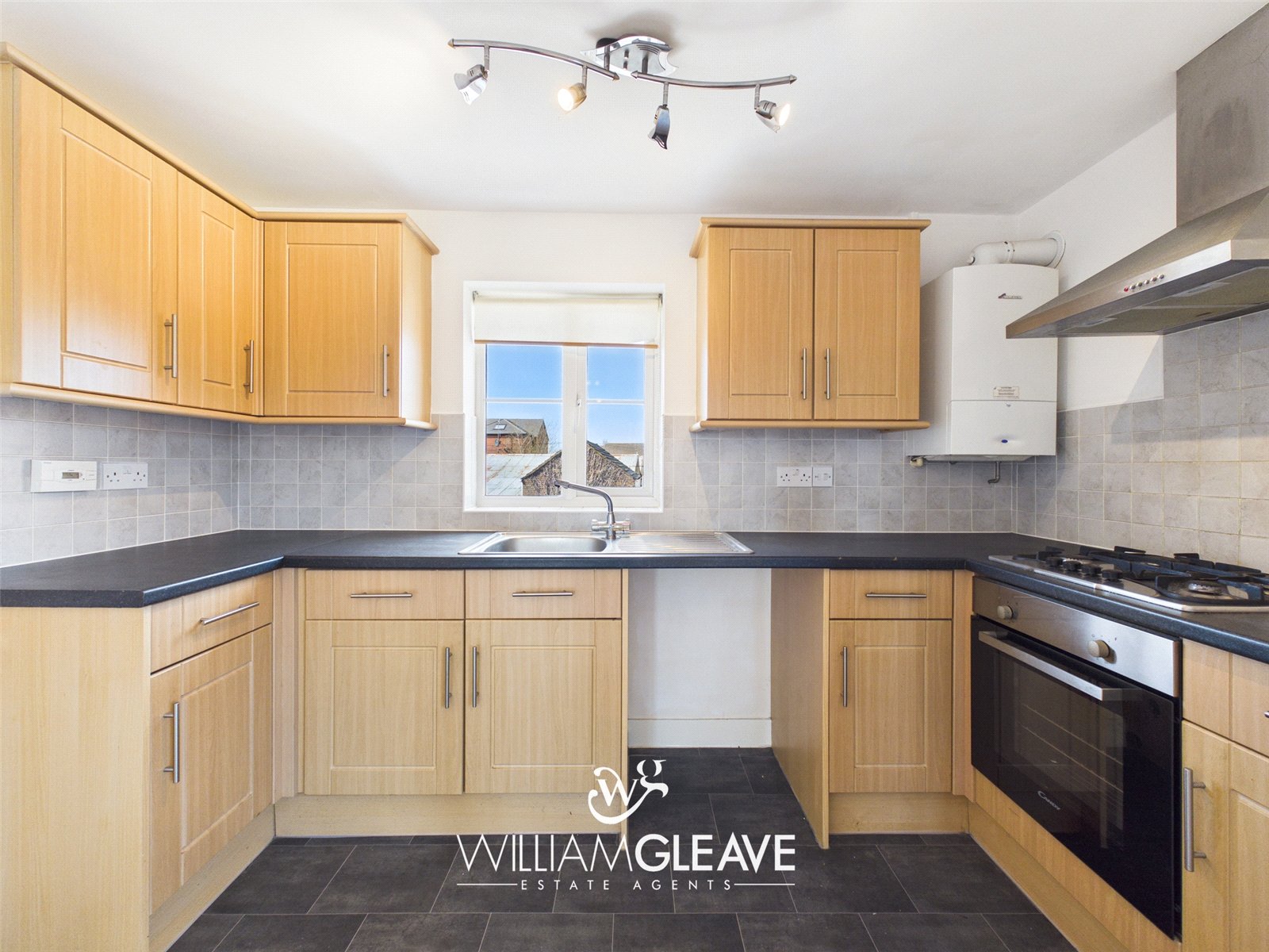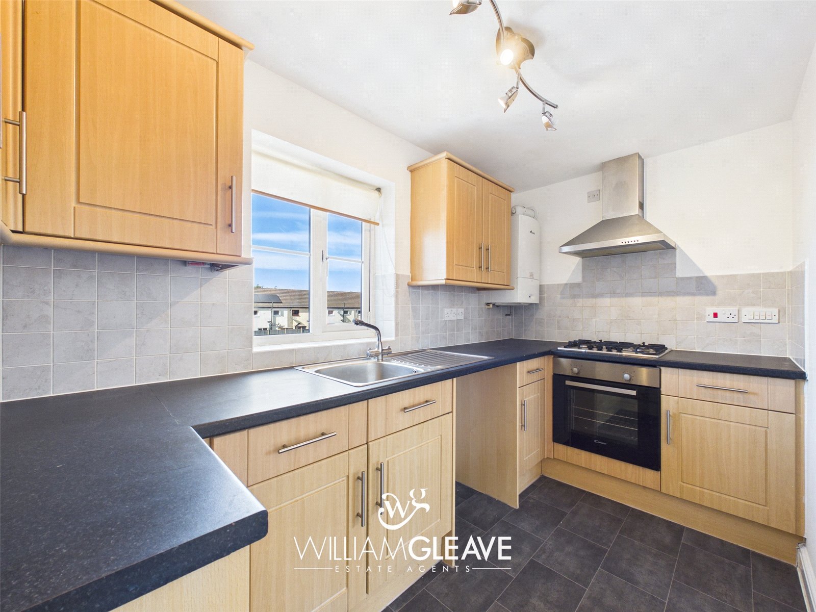 The fitted kitchen comprises a range of wall, drawer and base units with complementary work surfaces over, incorporating an inset sink with drainer and mixer tap. Integrated appliances include an oven, four-ring gas hob, and extractor hood, with additional space provided for white goods. The kitchen is further enhanced by a tiled splashback, a window to the rear elevation, and a wall-mounted boiler.