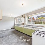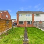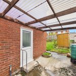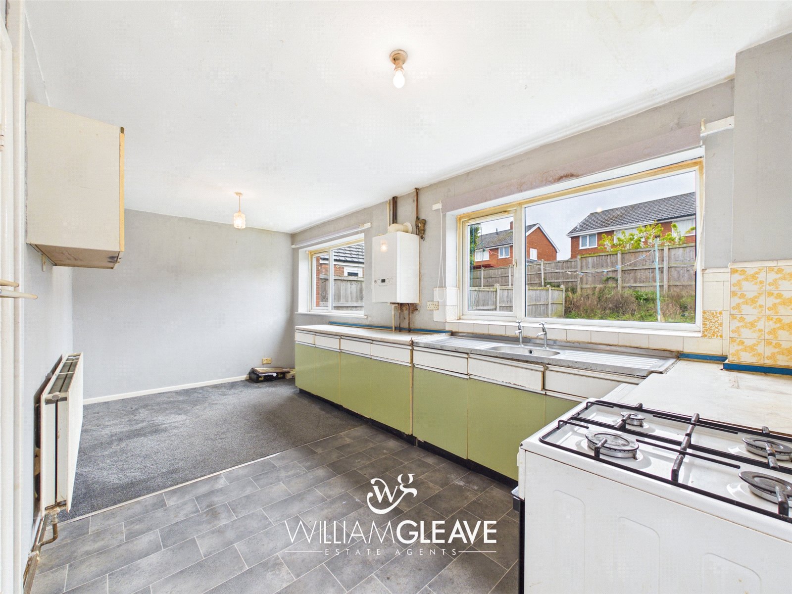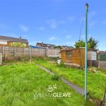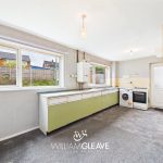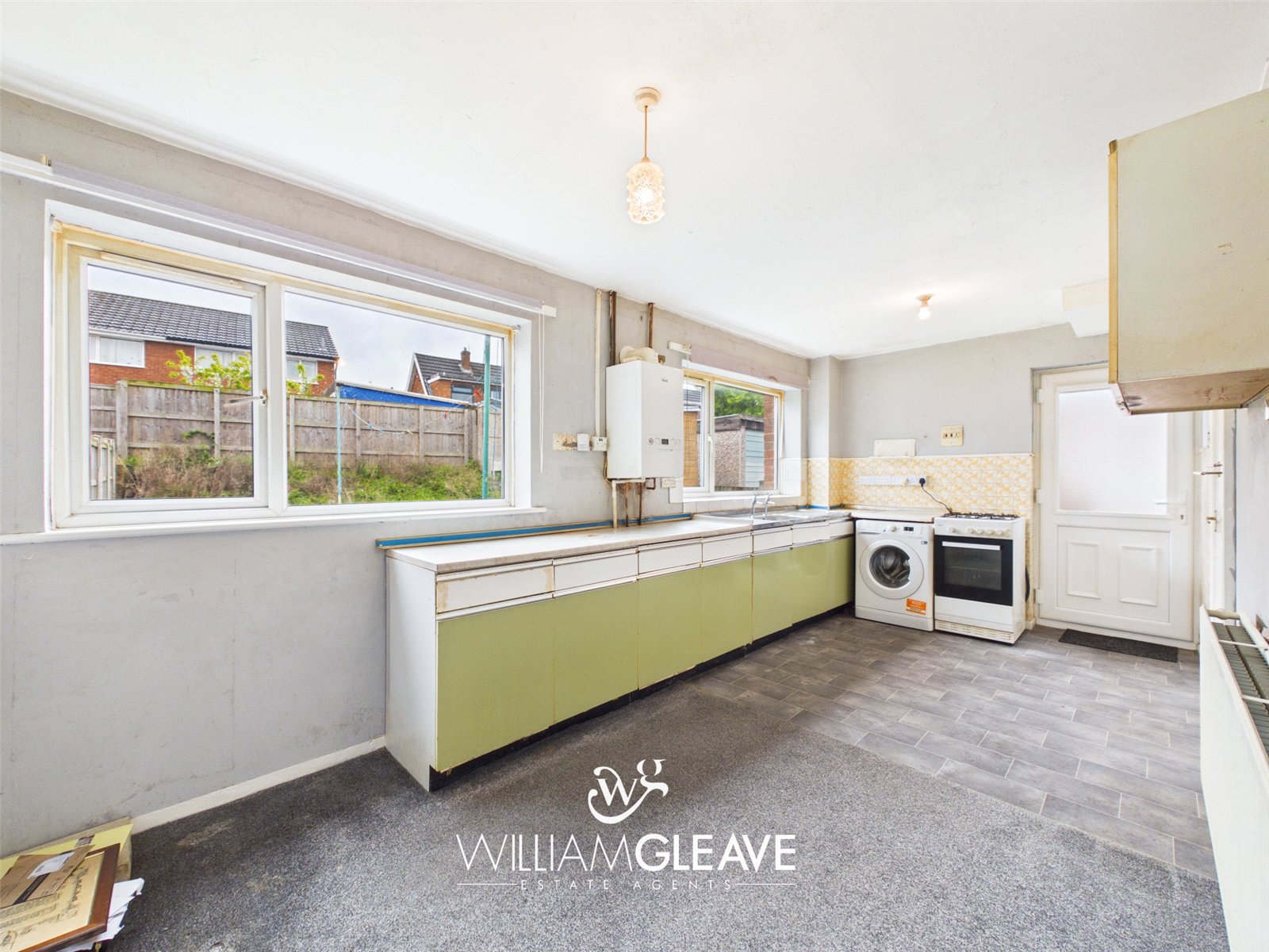 The room benefits from a dual aspect, with two windows to the rear elevation, and features a fitted kitchen comprising of a range of base units with work surfaces over and an inset stainless-steel sink with drainer. The walls are partly tiled, there is a wall-mounted boiler, space for appliances, a radiator, and power points. A door to the side leads out to the rear garden.