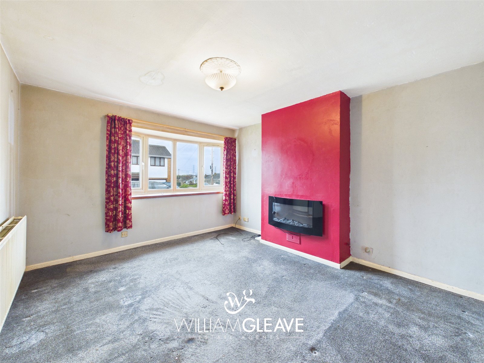 The room features an electric fire, a window to the front elevation, a radiator, and power points.