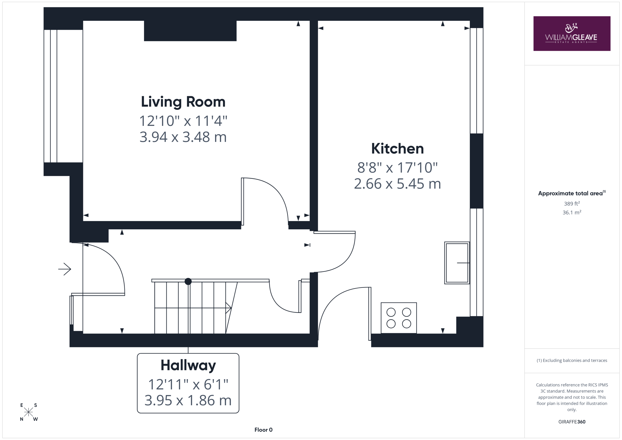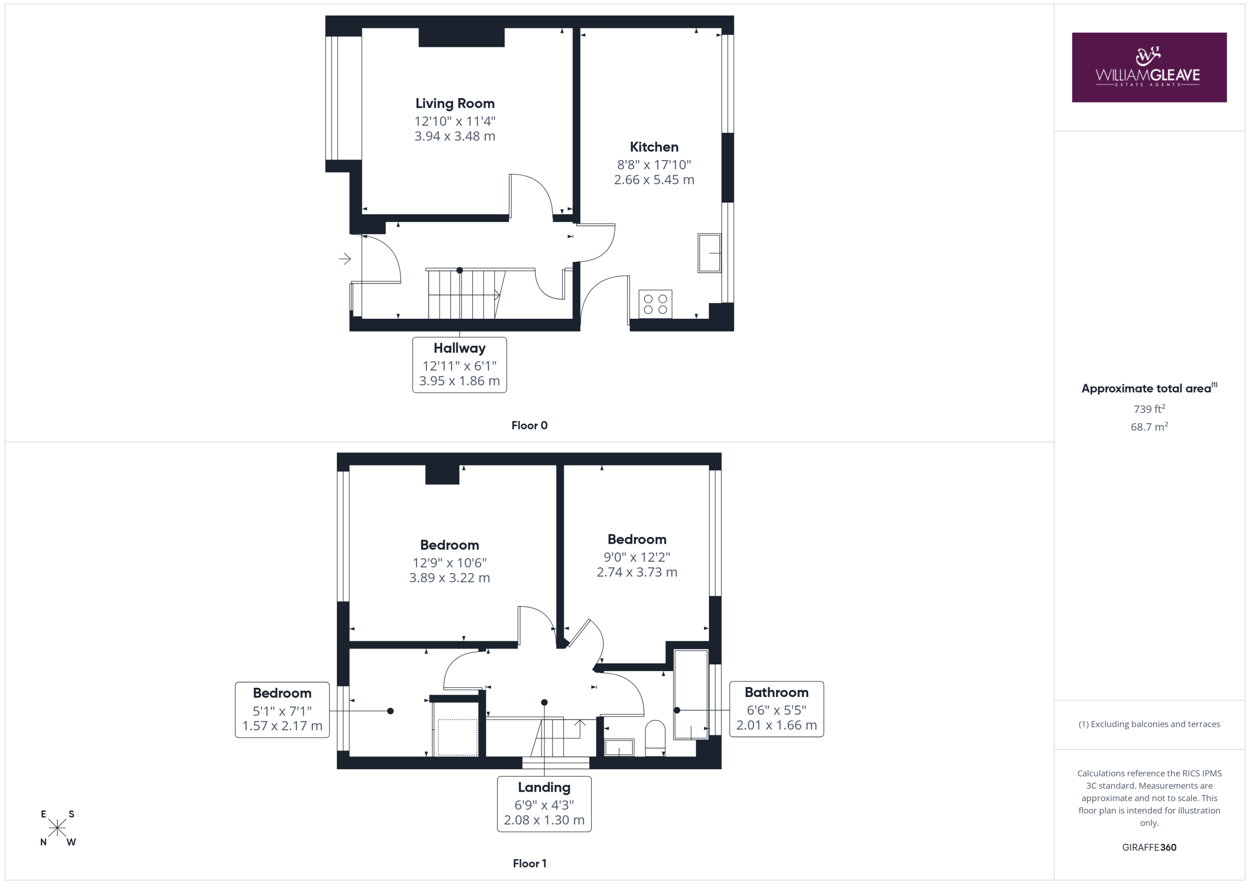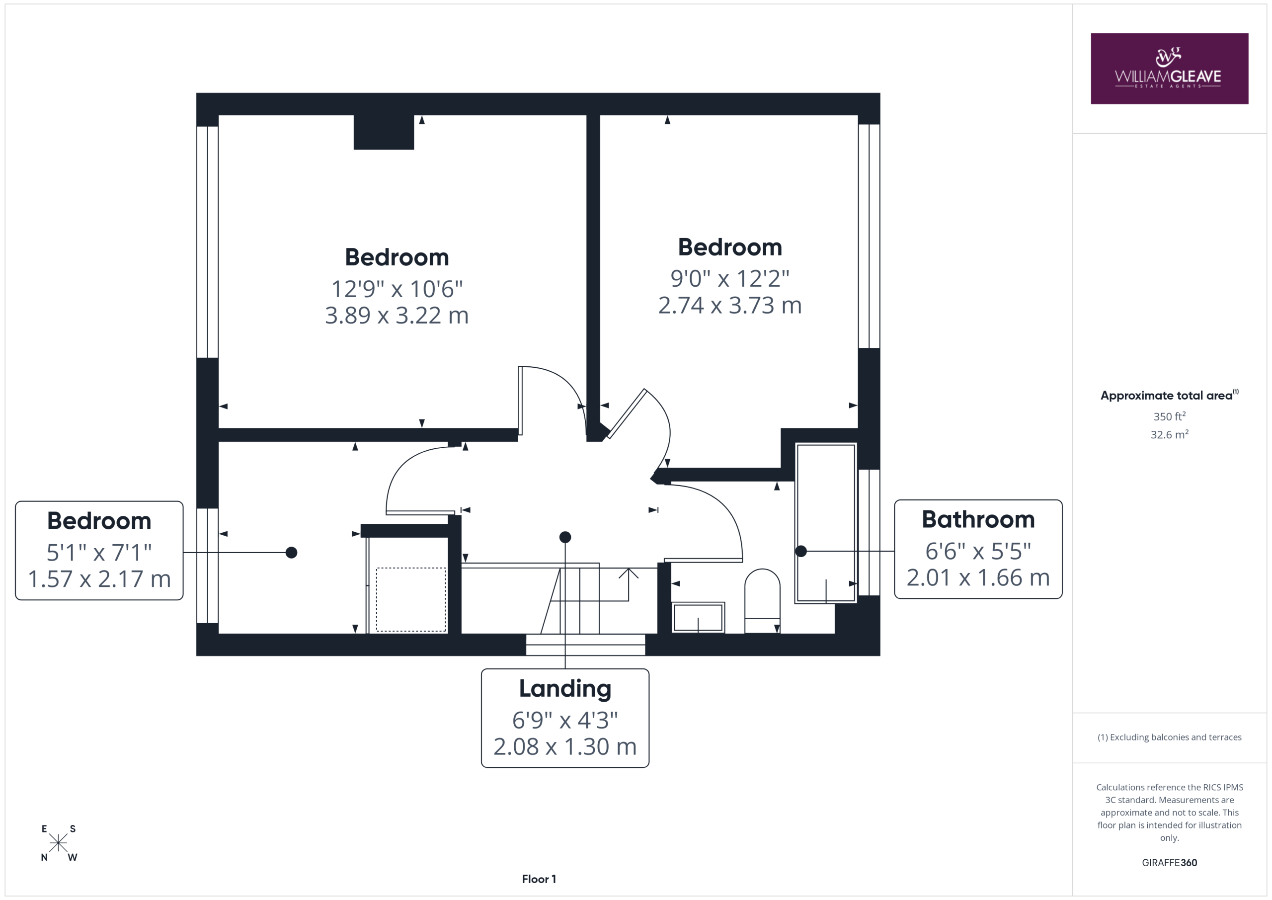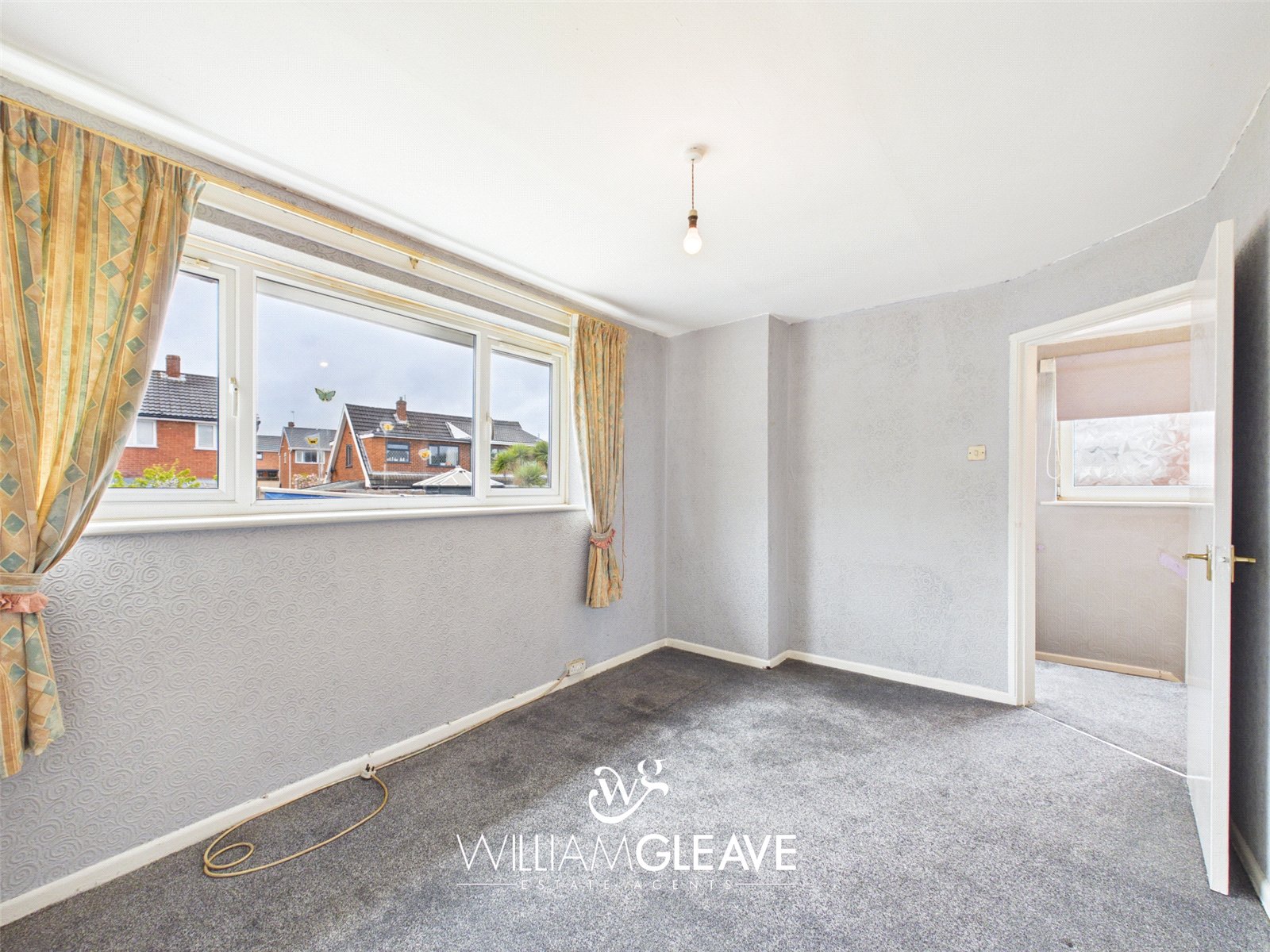 A frosted window to the side elevation provides natural light, with doors leading off to the bedrooms and bathroom.