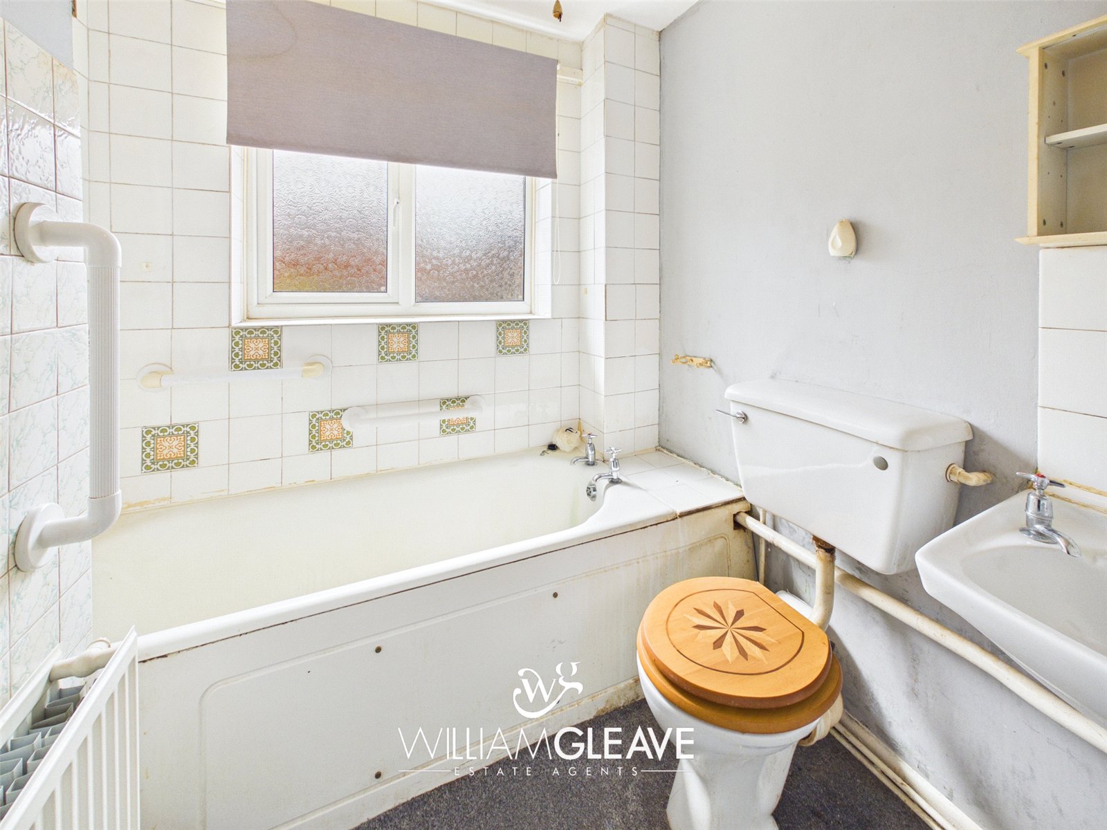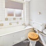 The bathroom is fitted with a three-piece suite comprising a panel-enclosed bath with handheld shower attachment, toilet, and wash hand basin. There is a frosted window to the rear elevation, a radiator, and partially tiled walls.